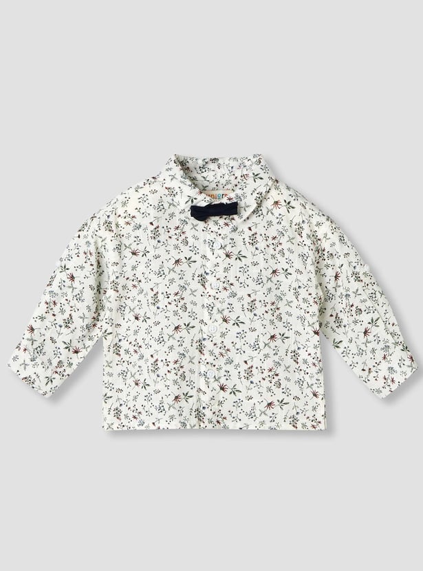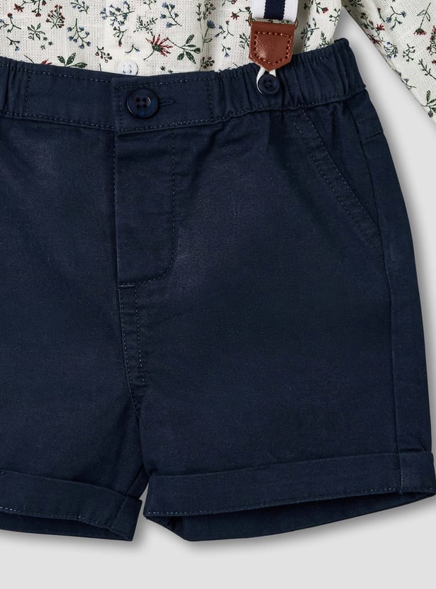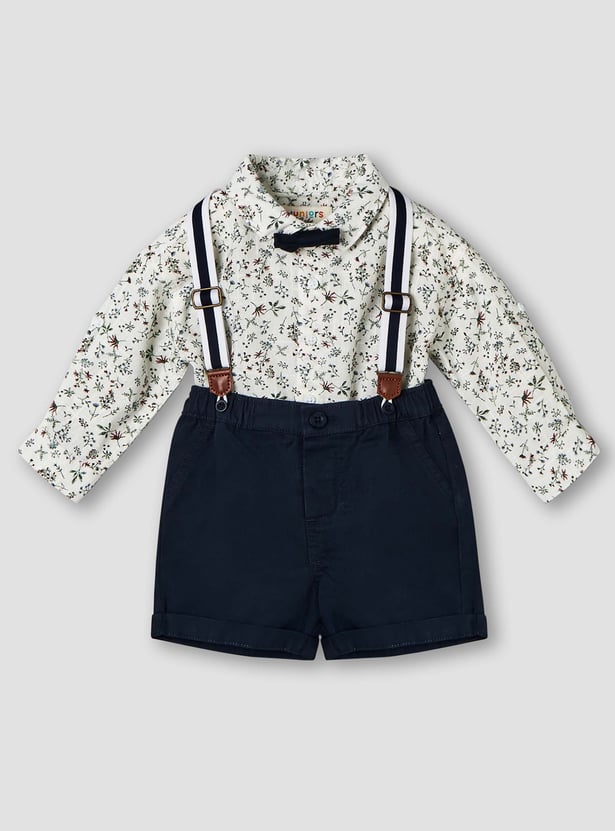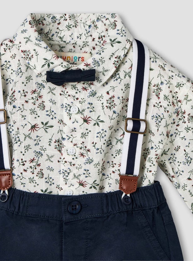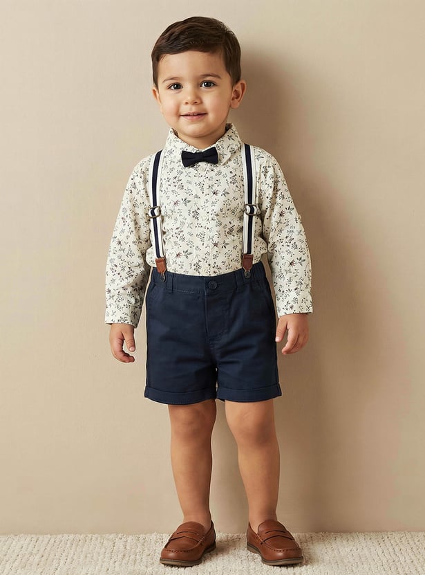Add a refined touch to his wardrobe with this charming floral print shirt and shorts set, complete with suspenders. The collared long-sleeve shirt features an all-over floral print and a cute bow applique at the collar, paired with smart tailored shorts designed with side and back pockets for added practicality. Finished with suspenders for a polished look, this set is made from soft, comfortable fabric, perfect for special occasions and dressy outings.
