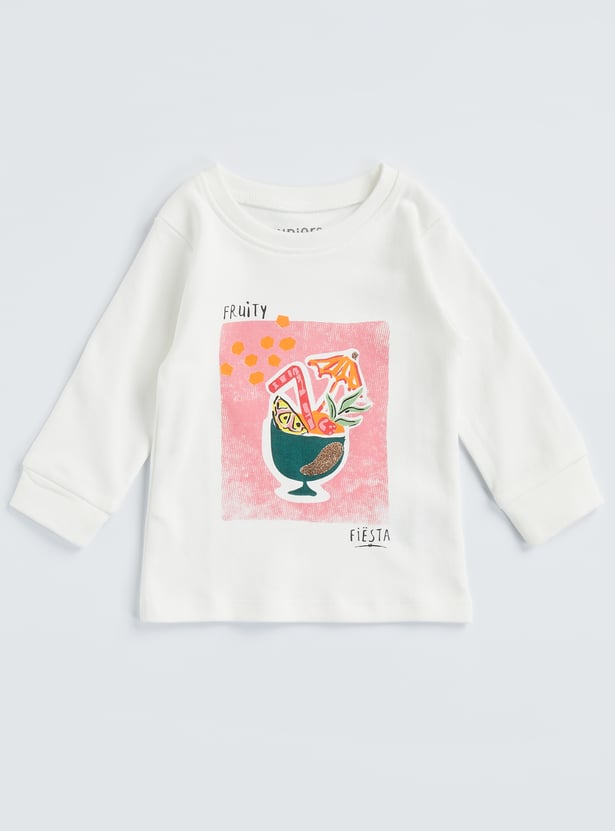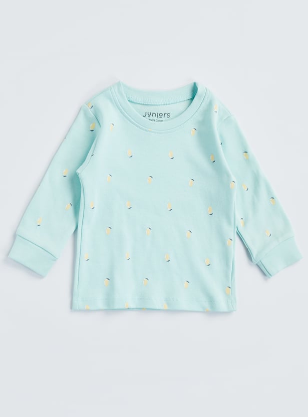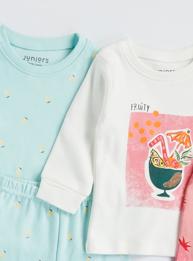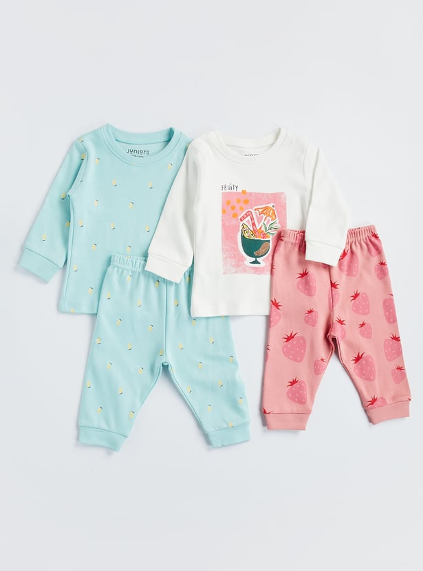 Make bedtime brighter and comfier with the cute Juniors fruit print t-shirt and pyjama set of 2. This pack comes with two t-shirt and pyjama sets, each designed with a comfy round neckline and full sleeves for cosy coverage. The fun fruit prints add a playful touch, while the matching pyjamas feature a soft elasticated waistband for an easy, snug fit. Perfect for sleep time, lounging, or lazy weekends at home, these sets keep your little one feeling relaxed and happy. Made from soft, breathable fabric, they’re gentle on the skin and comfy all day long.