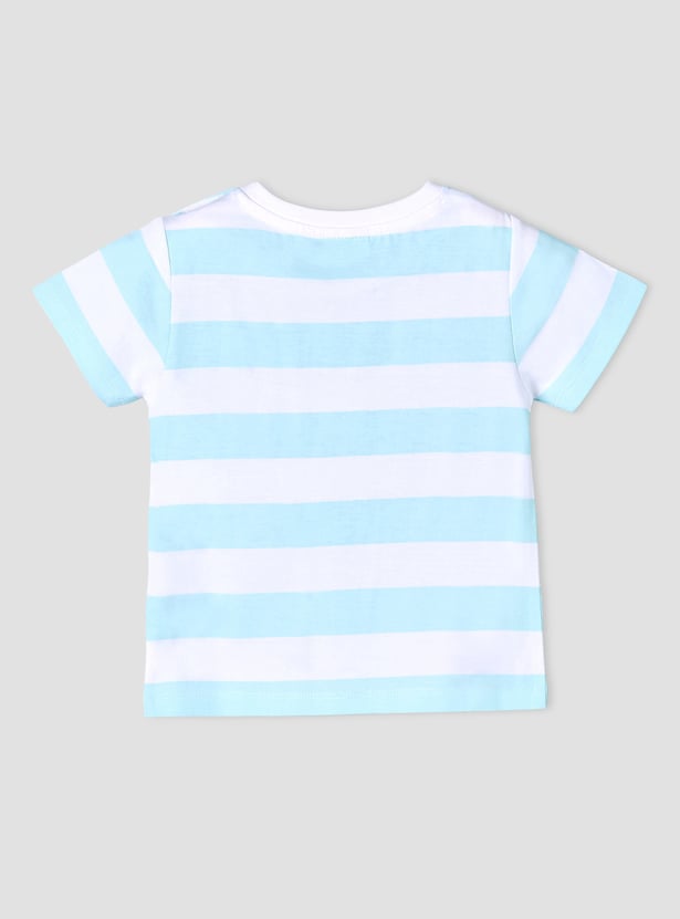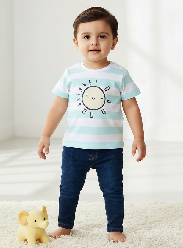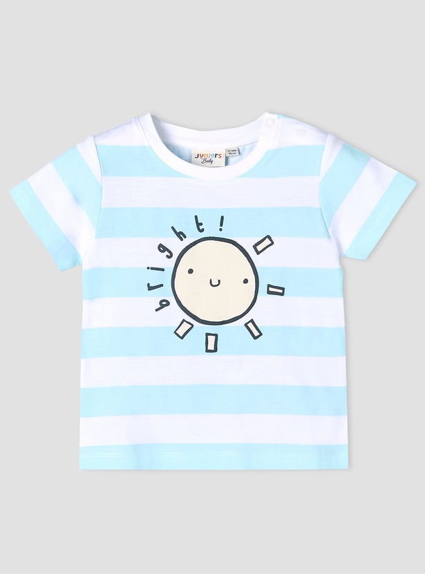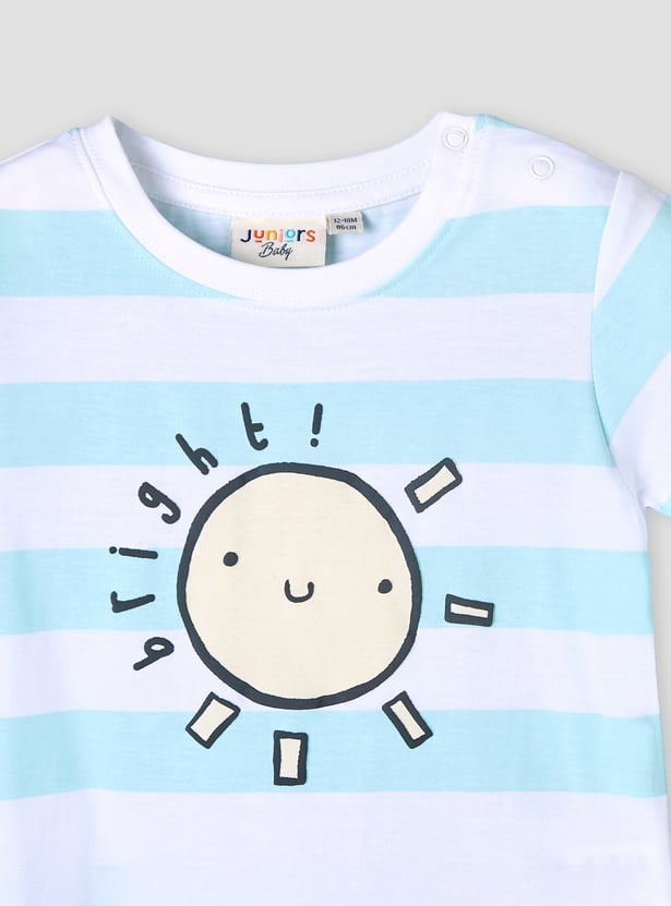This charming striped T-shirt for baby boys features a delightful sun print, perfect for adding a cheerful touch to their wardrobe. Crafted from soft, breathable fabric, it ensures optimal comfort for your little one throughout the day. The short sleeves and crew neckline provide a comfortable fit, making it an ideal choice for everyday wear or playful outings. Elevate your baby's style with this adorable and practical T-shirt.