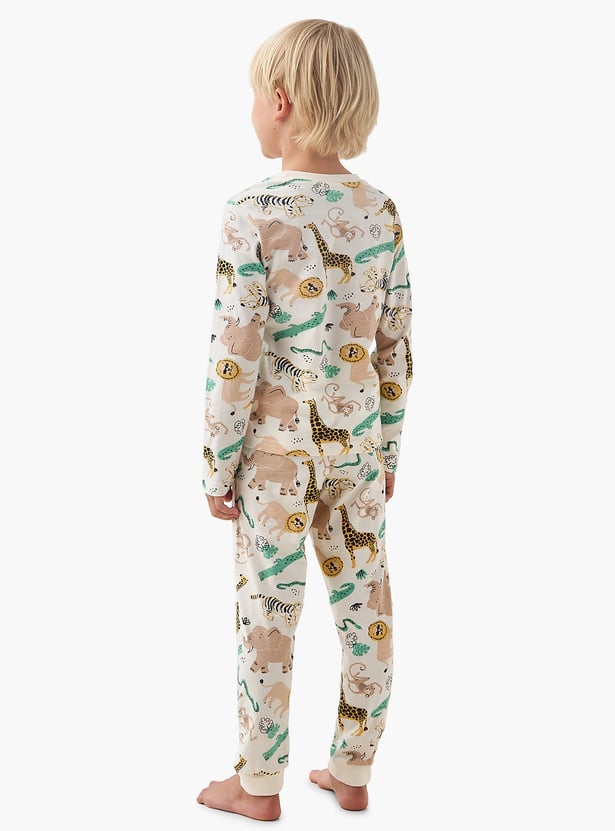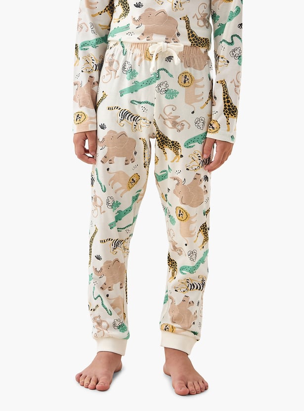 Bring a little adventure to bedtime with this adorable safari-inspired pyjama set. The long-sleeved T-shirt features a playful all-over animal print, paired with matching pyjama bottoms for a coordinated look. Designed with a comfortable crew neckline and an elasticated waistband, it ensures a snug yet relaxed fit for restful nights and cosy lounging. Crafted from soft, breathable fabric for gentle comfort all night long.