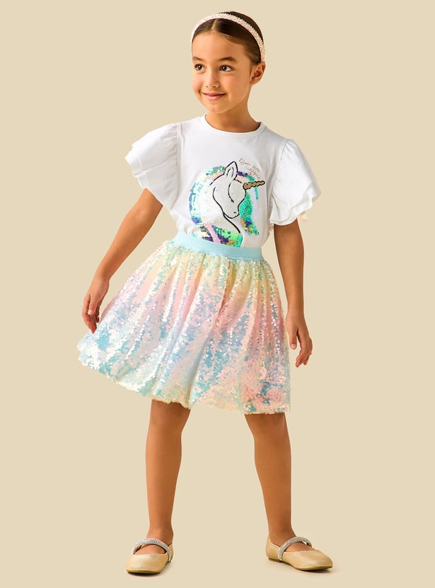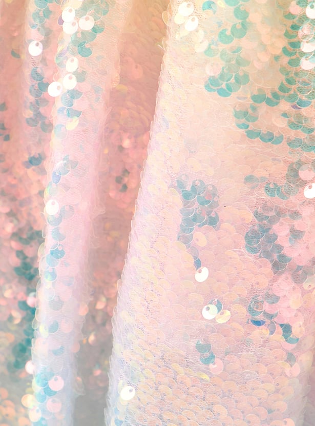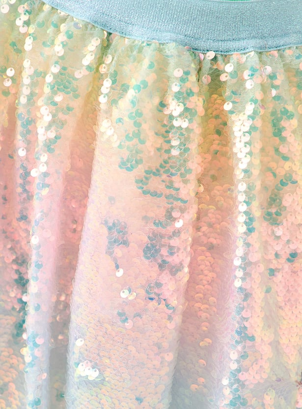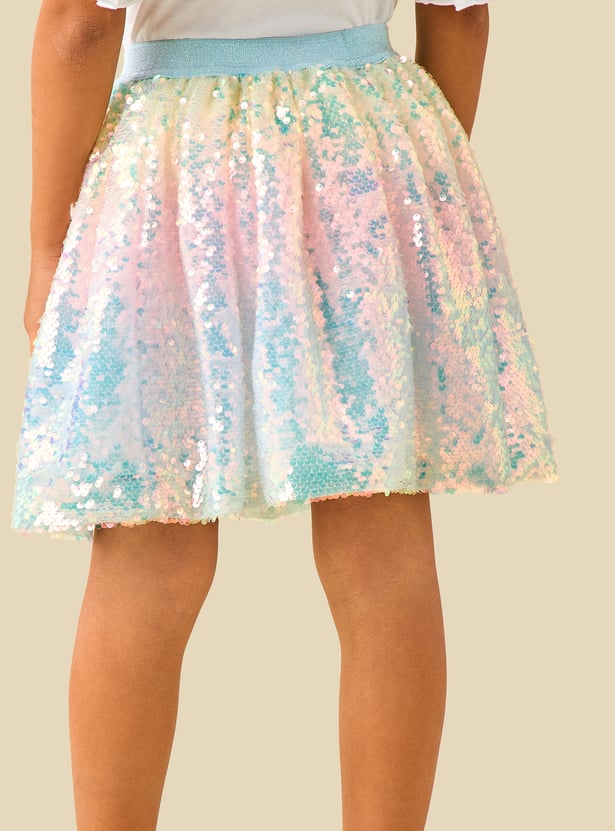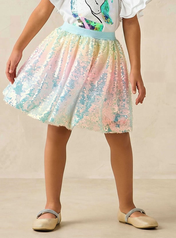 Discover this delightful sequinned skirt, perfect for adding a touch of sparkle to her wardrobe. The skirt features a vibrant, iridescent sequin design and an elasticated waistband. The fabric is long-lasting and durable.
