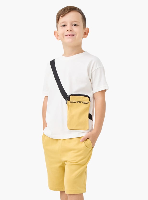 Comfort meets style in this set for toddler boys. Crafted from soft fabric, this set includes a solid t-shirt and matching shorts, ensuring all-day comfort for your little one. The t-shirt features short sleeves, a crew neckline, while the shorts have an elastic waistband for a perfect fit. Ideal for any occasion, this set comes with a faux crossbody bag.