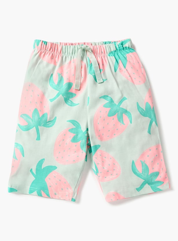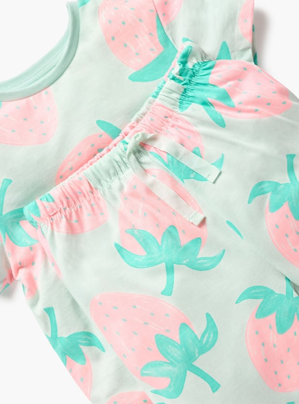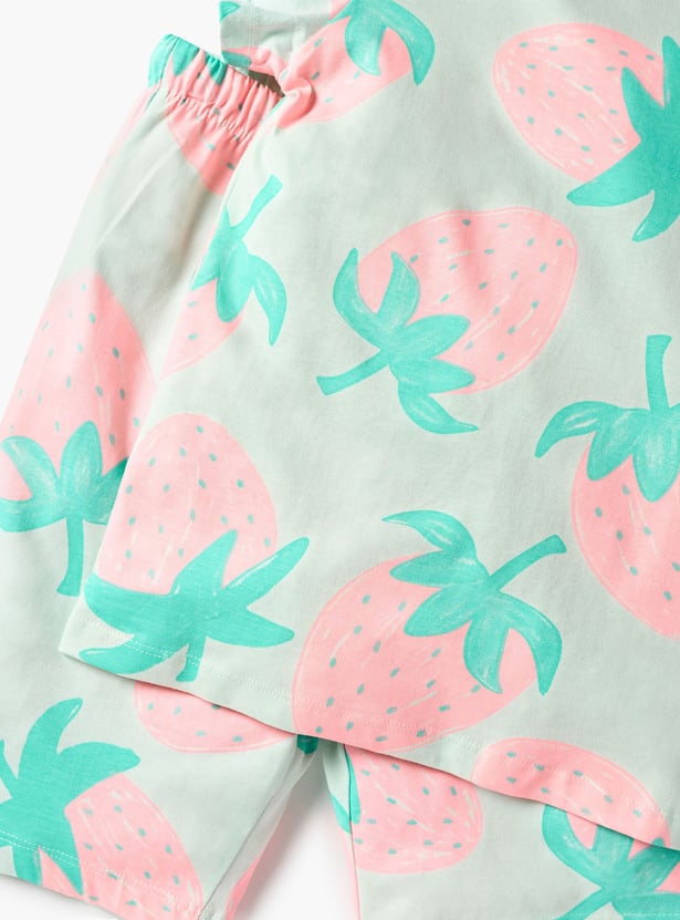 This delightful two-piece t-shirt and shorts set features a playful strawberry pattern, perfect for your young girl's nightwear collection. Crafted from soft fabric, it ensures comfort throughout the night, while the short sleeves offer breathability. Easy to maintain with machine-washable care, this set combines practicality with style, making bedtime routines a breeze. Ideal for those cherished family evenings at home.