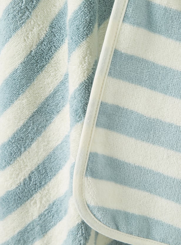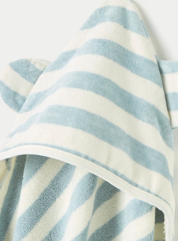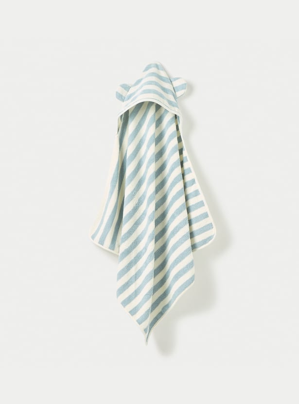 This hooded towel is made from soft fabric that is gentle on your baby's skin. It is also absorbent and dries quickly, making it ideal for use after bath time. The hood provides warmth and comfort, and the stripes add a touch of style.