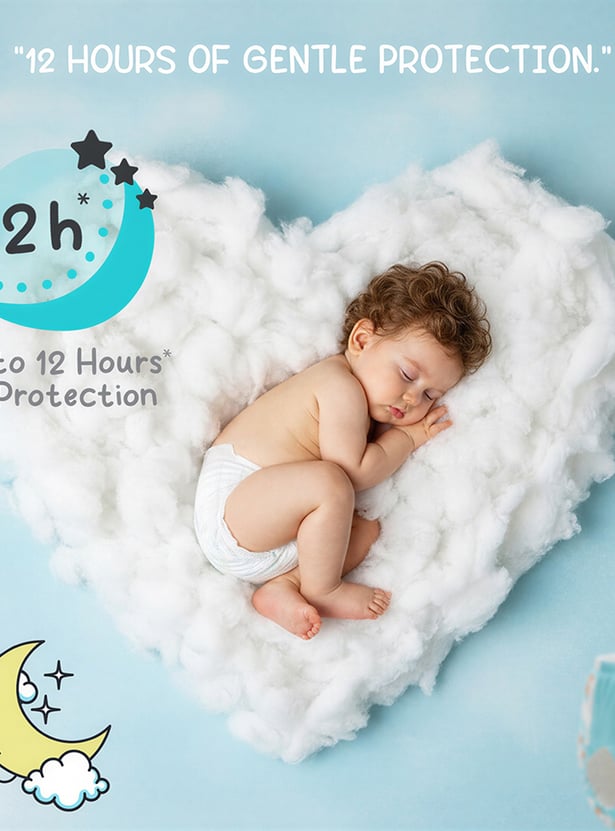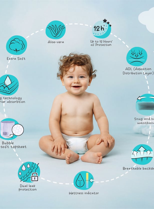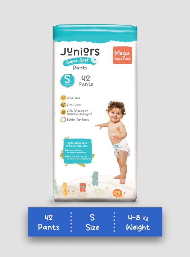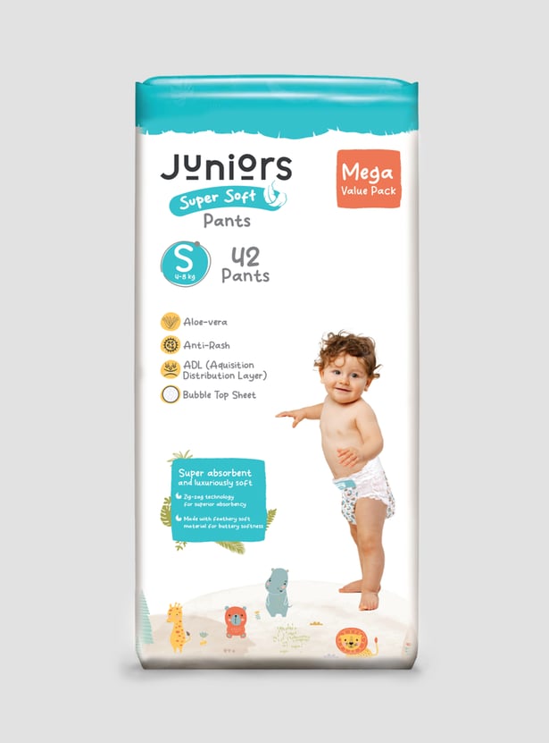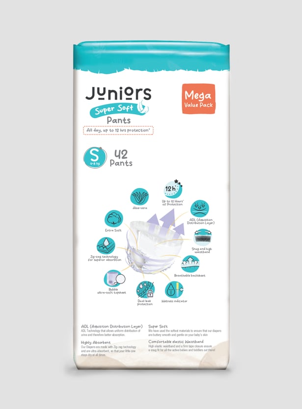Keep your baby happy and dry with Juniors Super Soft Pants, designed for up to 12 hours of protection. The fast-absorbing layer locks in moisture, while the snug, high waistband ensures a perfect fit. With a breathable back sheet and wetness indicator, you'll always know when it's time for a change. Our dual leak protection and zig-zag absorption keep leaks away, while the bubble soft sheet and aloe vera care for your baby's delicate skin. Gentle, secure, and super absorbent because your little one deserves the best!