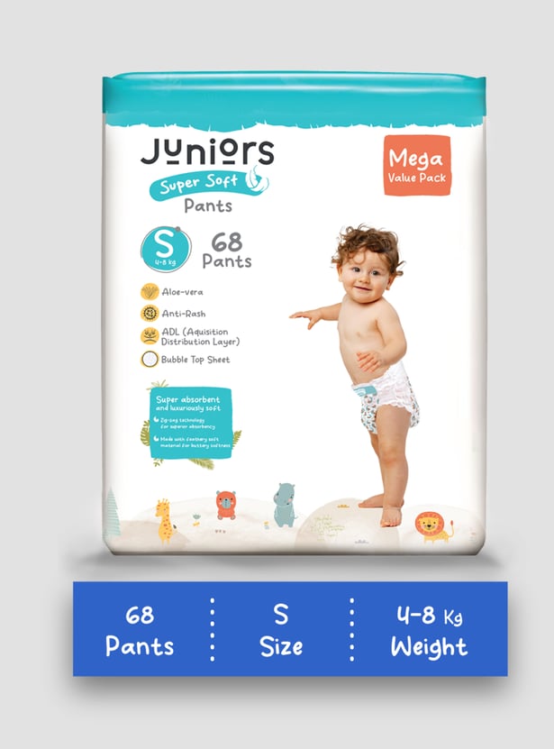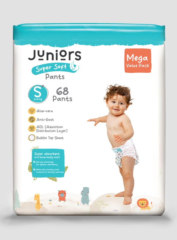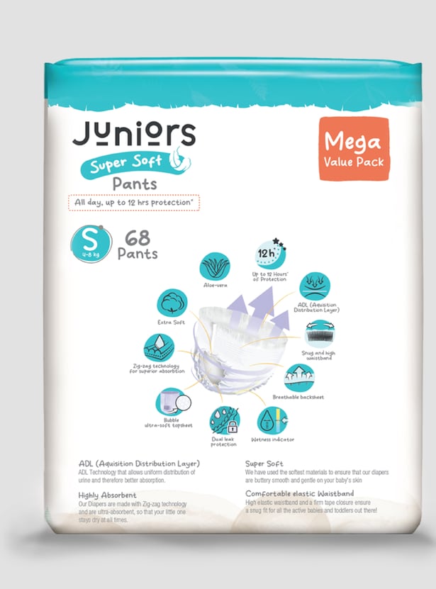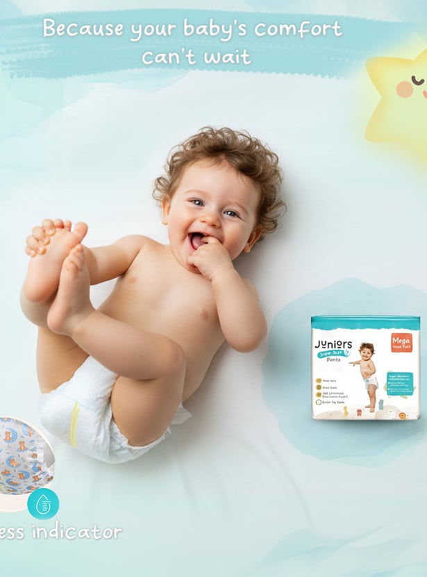 Keep your baby happy and dry with Juniors Super Soft Pants, designed for up to 12 hours of protection. The fast-absorbing layer locks in moisture, while the snug, high waistband ensures a perfect fit. With a breathable back sheet and wetness indicator, you'll always know when it's time for a change. Our dual leak protection and zig-zag absorption keep leaks away, while the bubble soft sheet and aloe vera care for your baby's delicate skin. Gentle, secure, and super absorbent because your little one deserves the best!