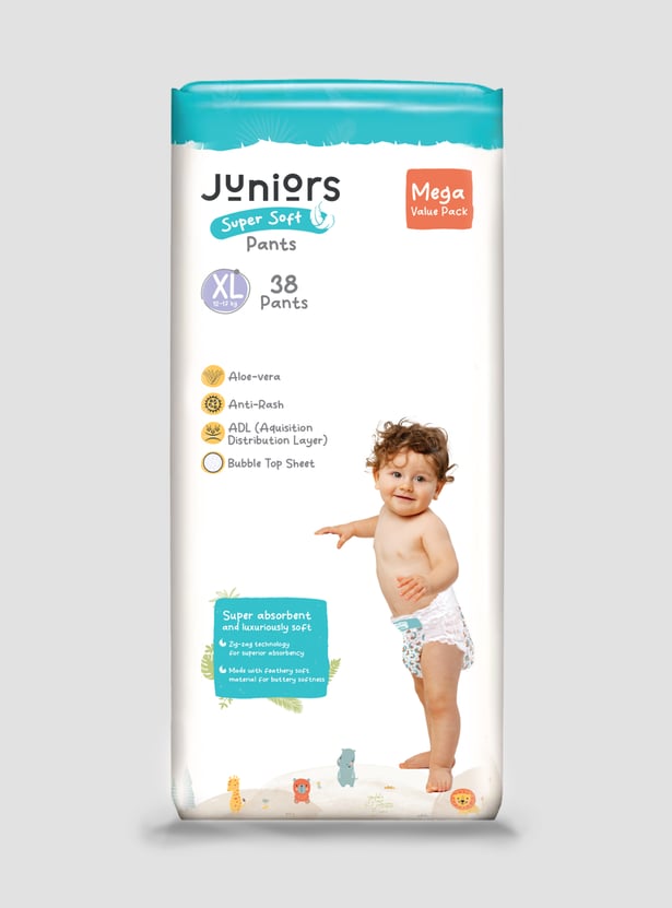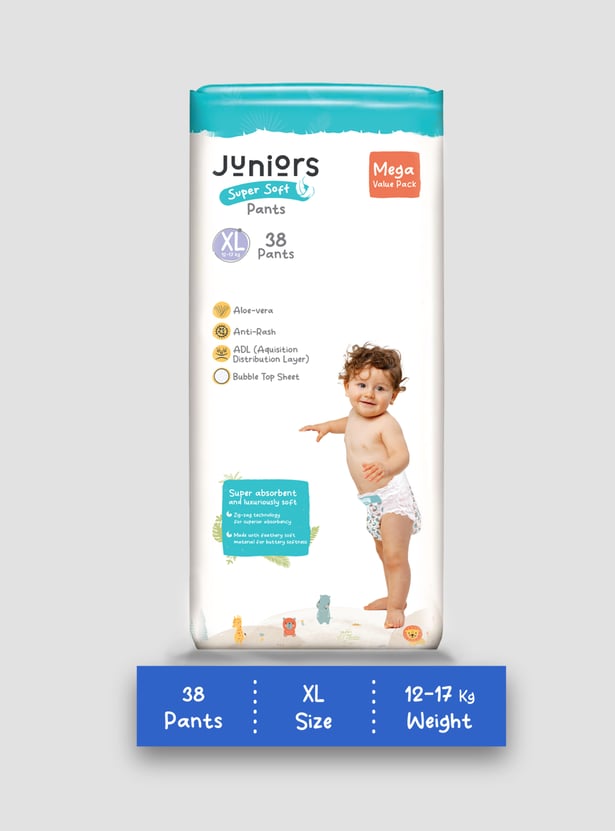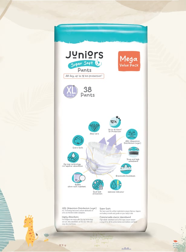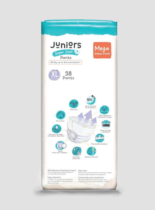 Keep your baby happy and dry with Juniors Super Soft Pants, designed for up to 12 hours of protection. The fast-absorbing layer locks in moisture, while the snug, high waistband ensures a perfect fit. With a breathable back sheet and wetness indicator, you'll always know when it's time for a change. Our dual leak protection and zig-zag absorption keep leaks away, while the bubble soft sheet and aloe vera care for your baby's delicate skin. Gentle, secure, and super absorbent because your little one deserves the best!