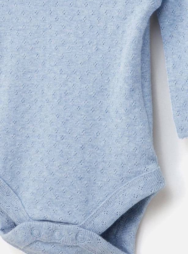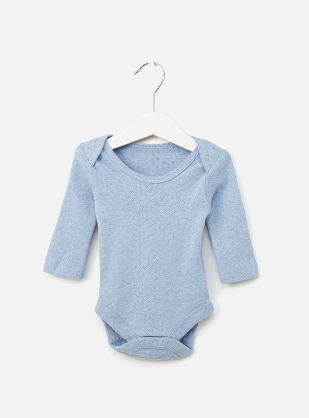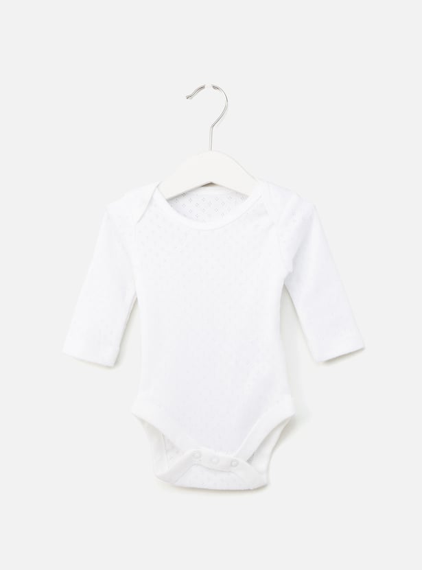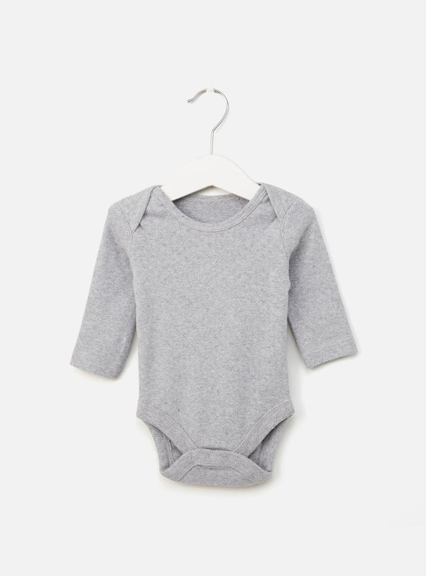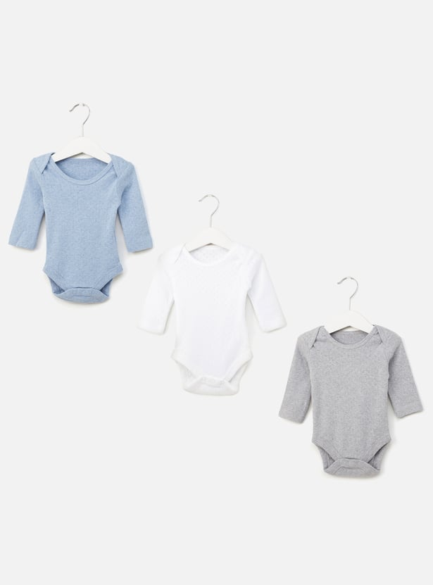 Pack this set of three textured bodysuits for your little one's next weekend getaway with the family. It highlights a round neckline and long sleeves that will lend comfortable dressing while the press button closure at the bottom makes diaper changes convenient. Tailored from soft fabric, the bodysuit will render a gentle feel on the skin all day.