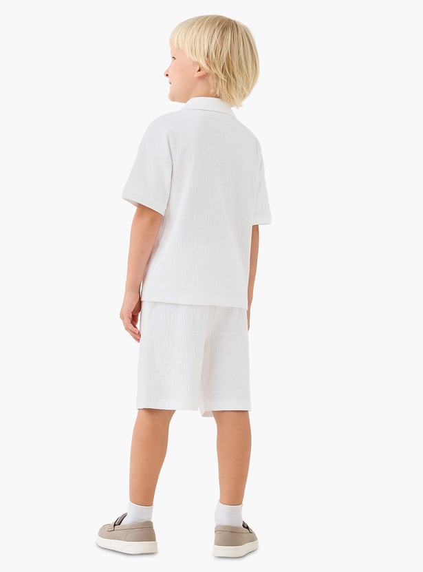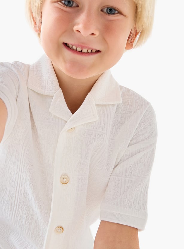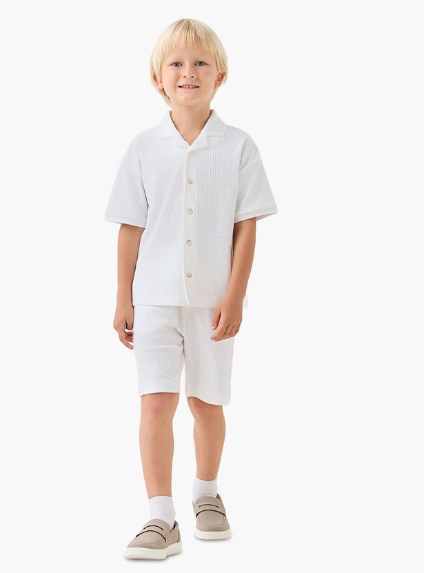 This charming two-piece set features a textured short-sleeved shirt and coordinating shorts. The shirt has a Cuban collar, while the shorts feature a drawstring waist and side pockets. Crafted from a comfortable fabric, it is soft and durable.