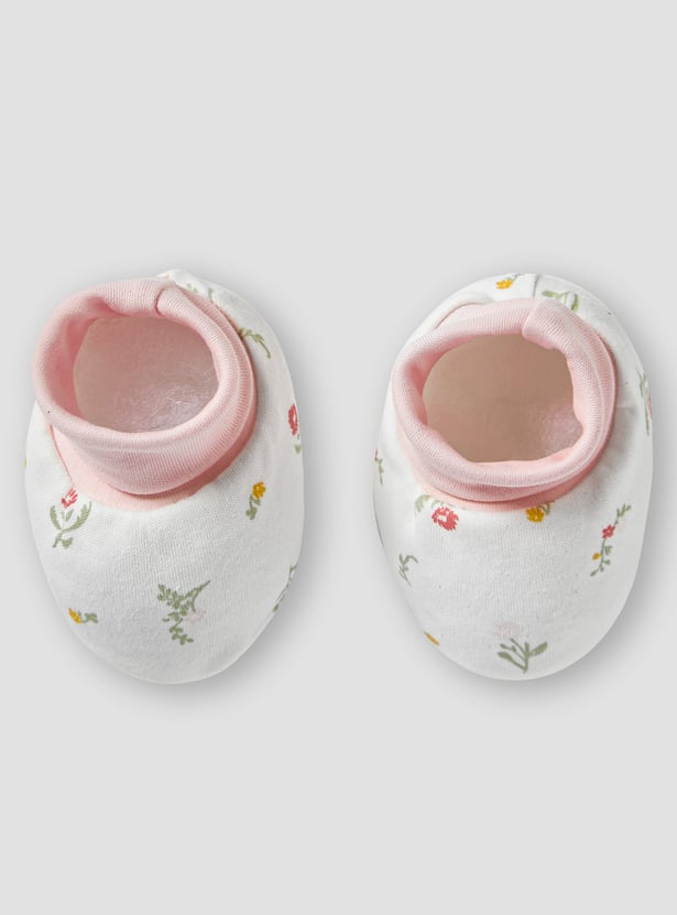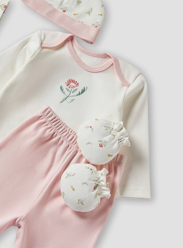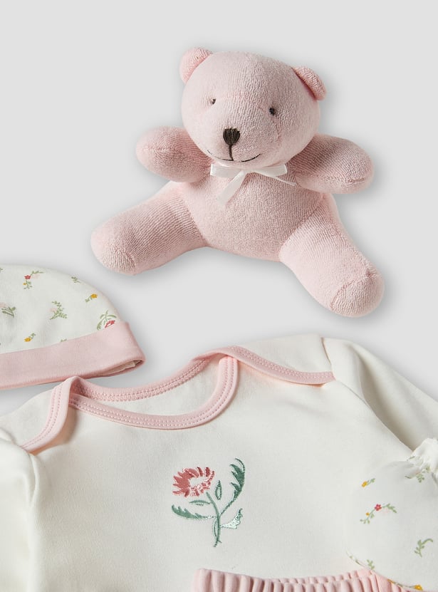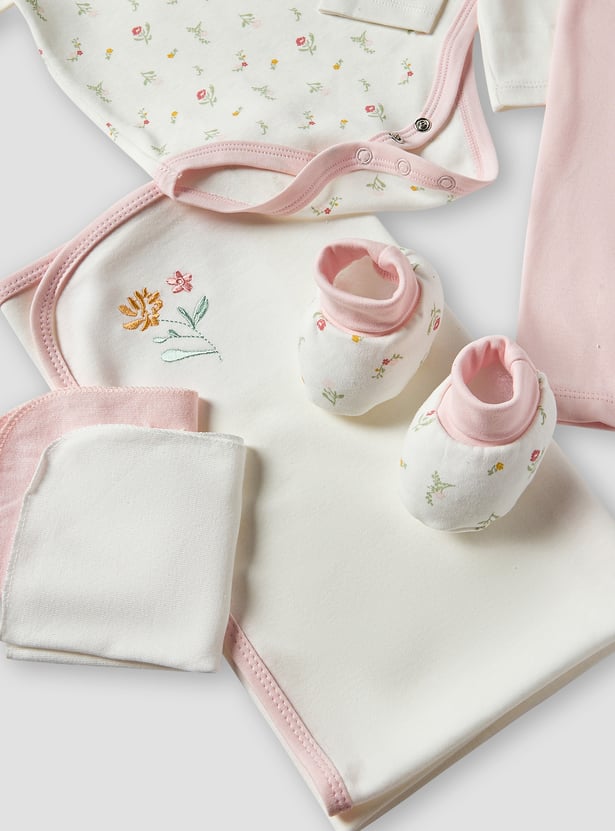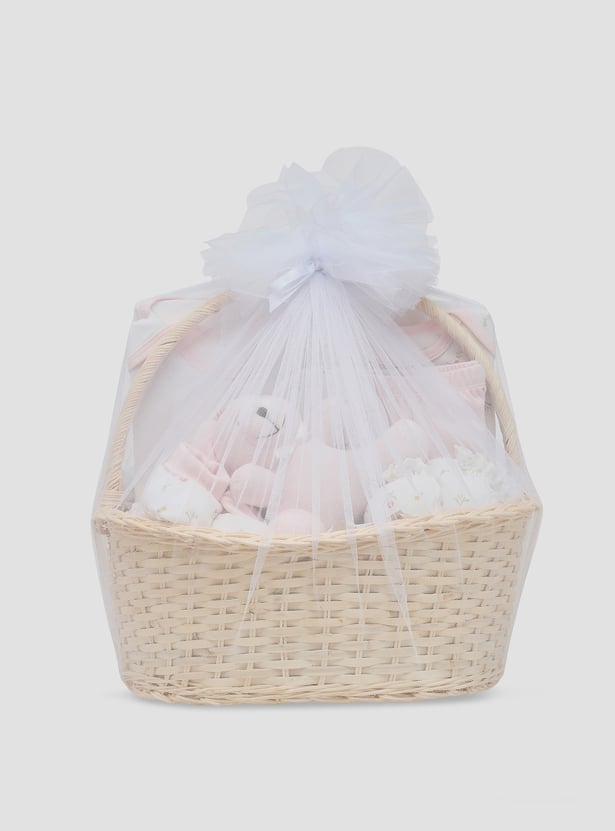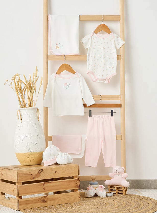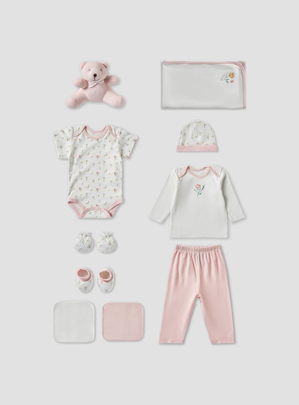 This charming ten-piece gift basket is perfect for newborn baby girls. The set includes a bodysuit, a long-sleeved top, trousers, a blanket, booties, mittens, a beanie two wash cloths and a teddy, ensuring she is comfortable and stylish. Delicate floral embroidery and print adds a touch of elegance to each piece, making it an ideal gift for new parents. This thoughtfully curated collection provides everything needed for a baby girl's first wardrobe essentials.