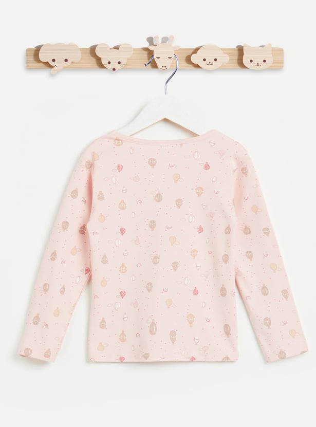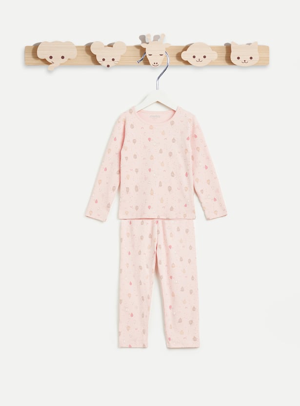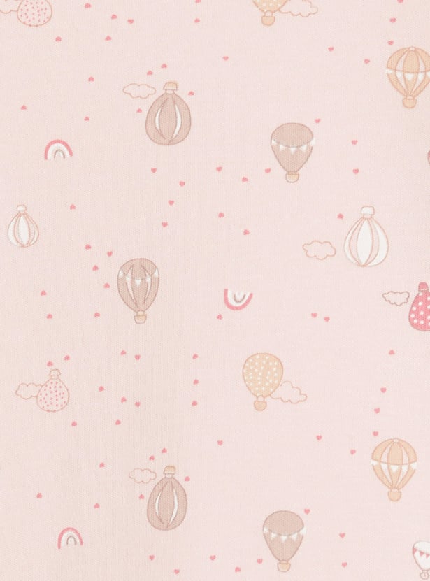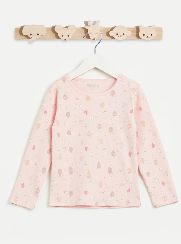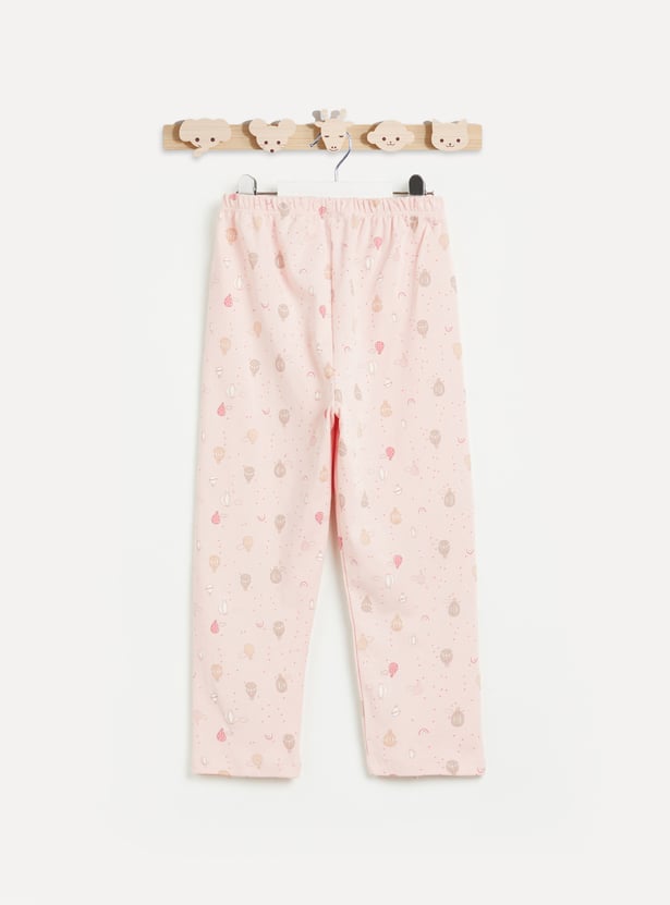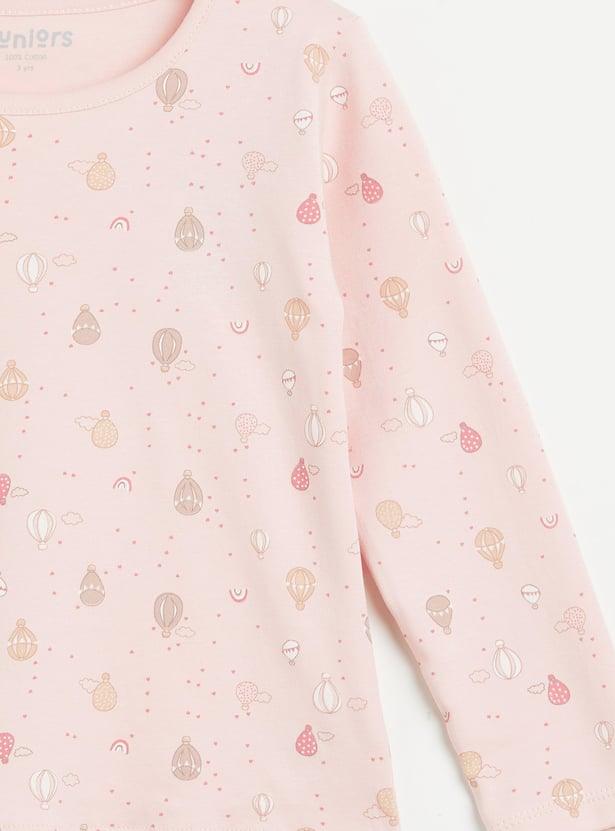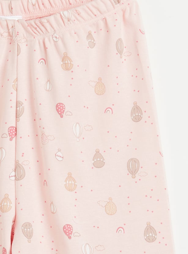 Make nighttime ritual fun with this sleepwear set featuring cute hotair balloon prints. It includes a T-shirt with a round neck and full sleeves. It is paired with matching printed pyjamas with an elasticated waist. This set is crafted from soft fabric for all-day comfort.