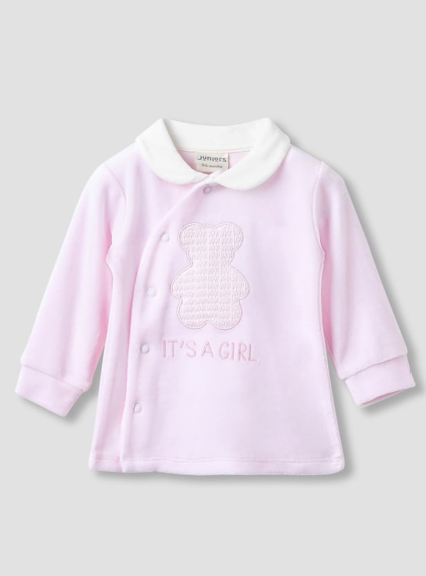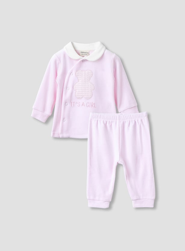 Dress your little one in this adorable two-piece velour pyjama set, perfect for comfortable sleep and play. The long-sleeved top features a sweet embroidered bear applique and a charming collar, ensuring a delightful appearance. Crafted from soft velour fabric, this pyjama set provides gentle warmth and comfort for delicate skin. The coordinating elasticated trousers complete this delightful ensemble, offering ease of movement for your baby girl.