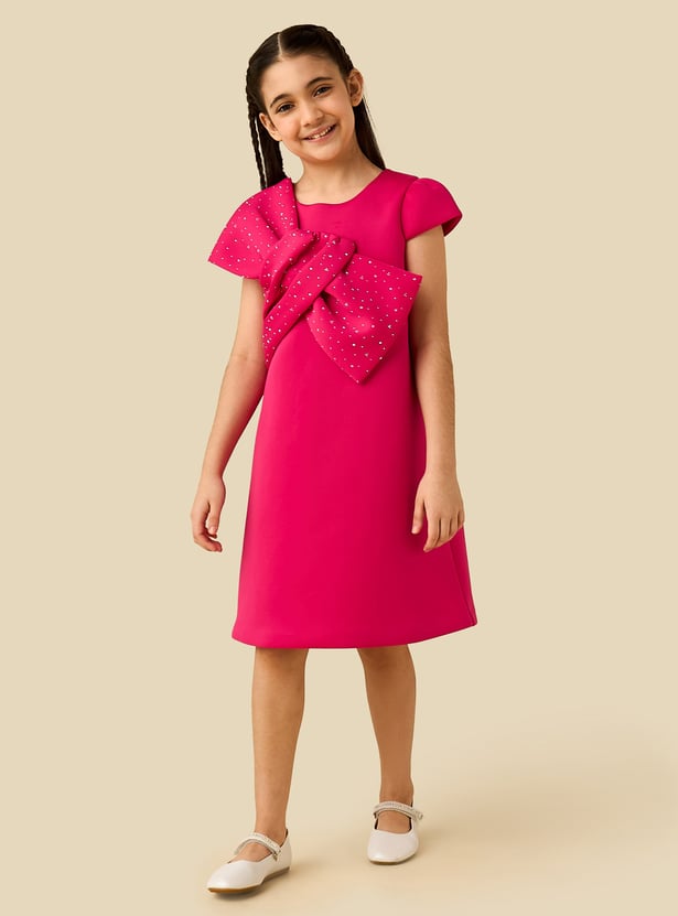 Dress your little one in timeless elegance with this beautiful girls’ dress, highlighted by a striking embellished bow that makes it perfect for special occasions. Designed to balance style and comfort, it offers a refined silhouette with cap sleeves and a classic round neckline, creating a look that’s both graceful and versatile. Ideal for birthday parties, formal gatherings, and memorable celebrations, this charming dress lets your child shine with confidence, crafted from soft, comfortable fabric for effortless wear.