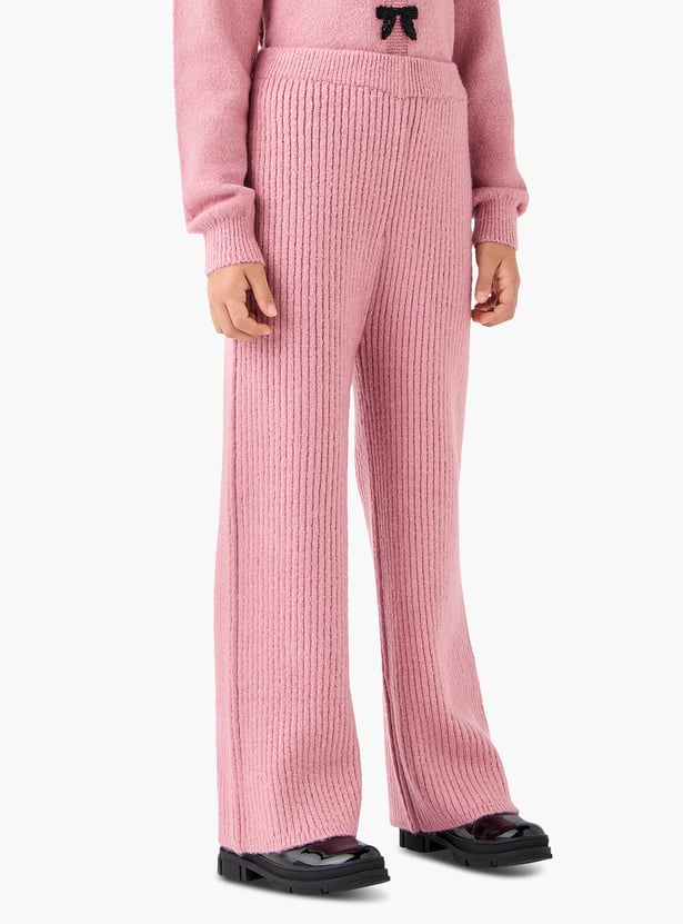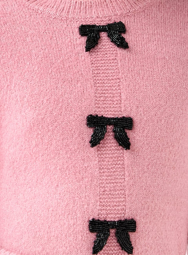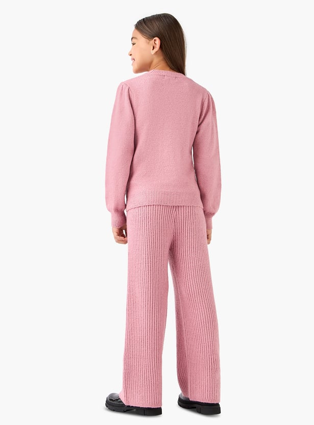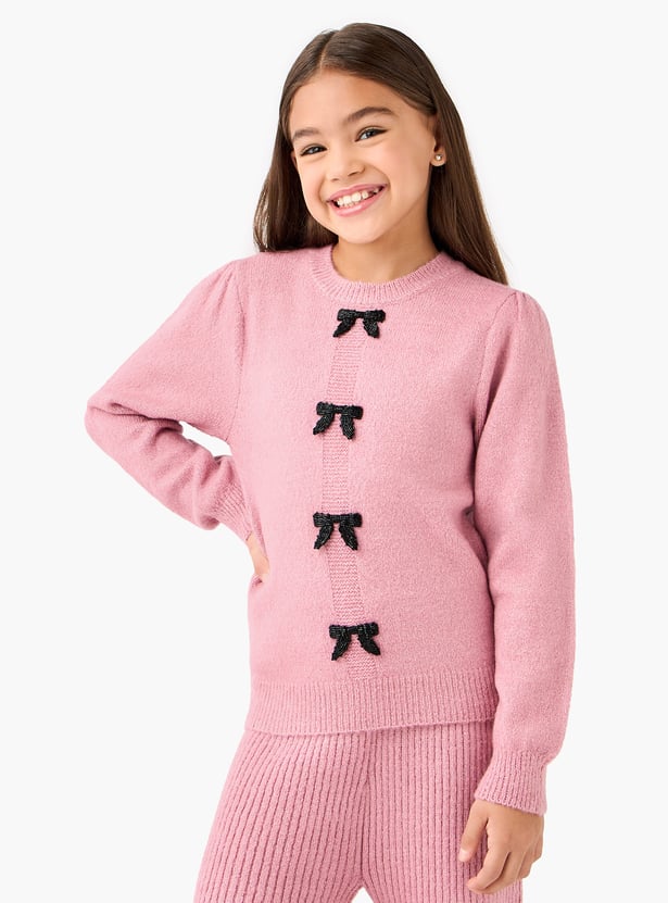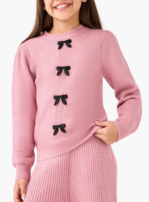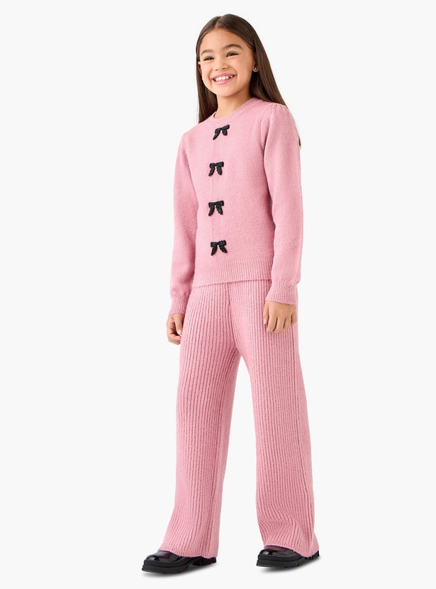 Introduce sophisticated style to your little one's wardrobe with this charming set, featuring a coordinating sweater and pants. The soft, long-sleeved sweater is beautifully adorned with contrasting bow applique details, offering a touch of playful elegance. Paired with comfortable ribbed knit wide leg pants that allow for unrestricted movement, this set is effortlessly chic.