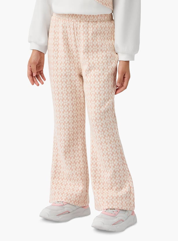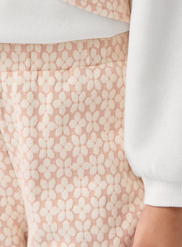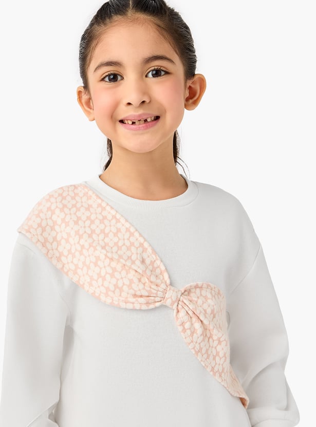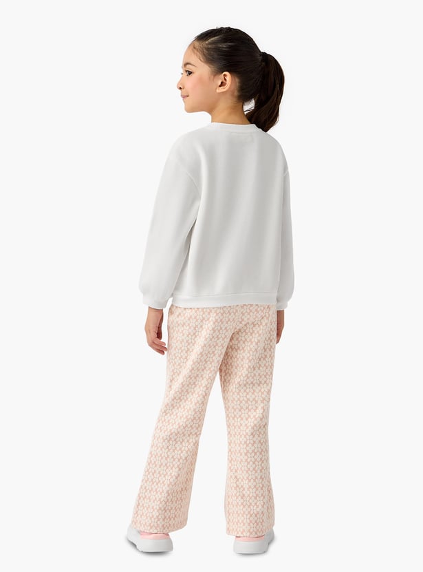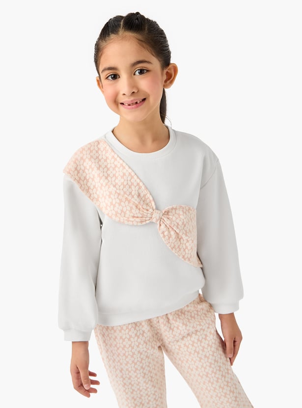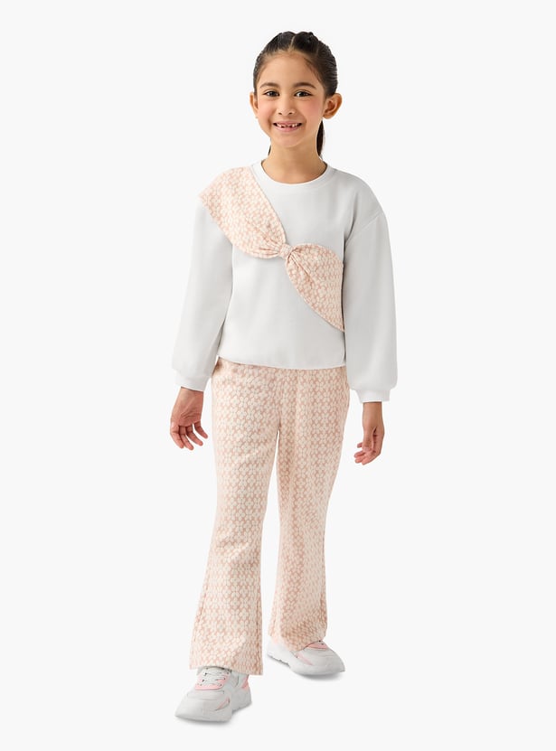 This charming two-piece set features a stylish patterned sweatshirt and textured pants. The sweatshirt showcases a unique bow detail, adding a touch of elegance to this comfortable outfit. Crafted from soft, quality material, this set ensures all-day comfort for your little one.