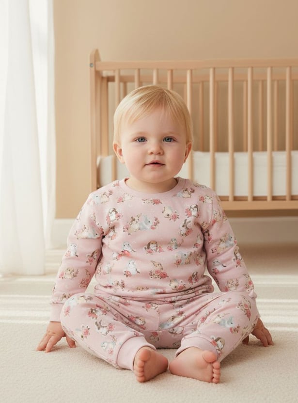 This adorable pyjama set for babies features a charming all-over print of bunnies and floral motifs, offering both comfort and delightful style. Crafted from soft, breathable fabric, this set includes a long-sleeved sweatshirt with convenient snap buttons at the shoulder for easy dressing. The coordinating trousers feature an elasticated waist for a secure yet gentle fit, ensuring maximum comfort for your little one throughout the night. This sleepwear set provides warmth and a cosy feel, making it an ideal choice for peaceful sleep.