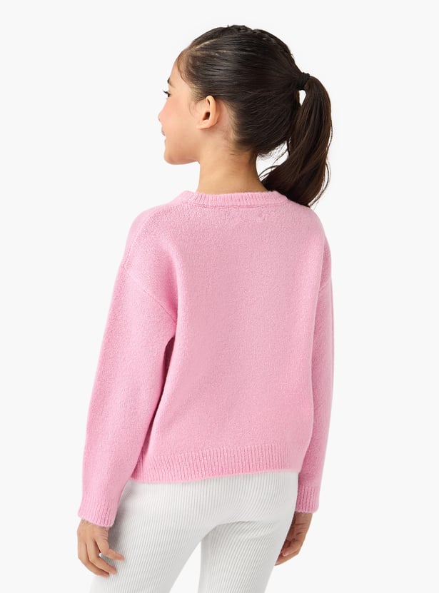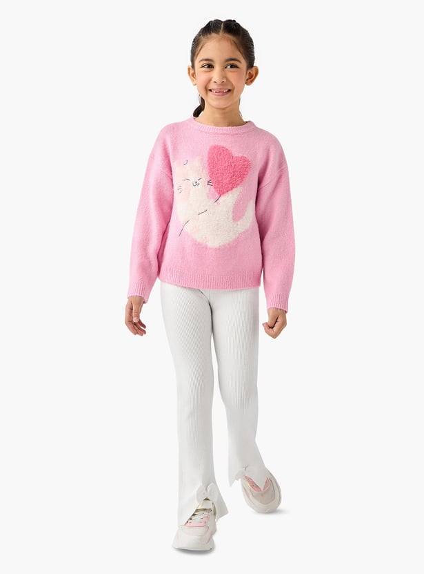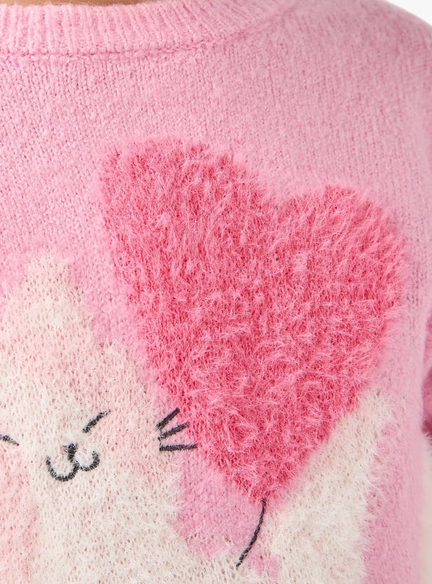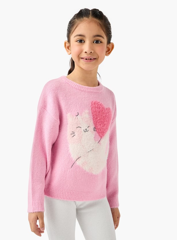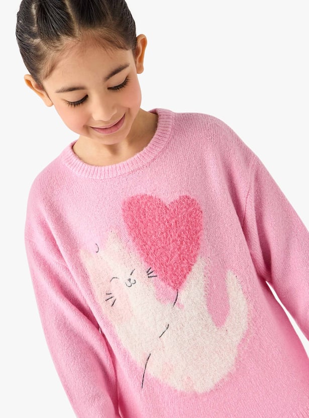 This kid's sweater, featuring a charming cat design, is perfect for adding a touch of whimsy to her wardrobe. The soft knitted fabric ensures comfortable all-day wear. The adorable cat and heart motif makes it a delightful addition to any young girl's autumn or winter collection.