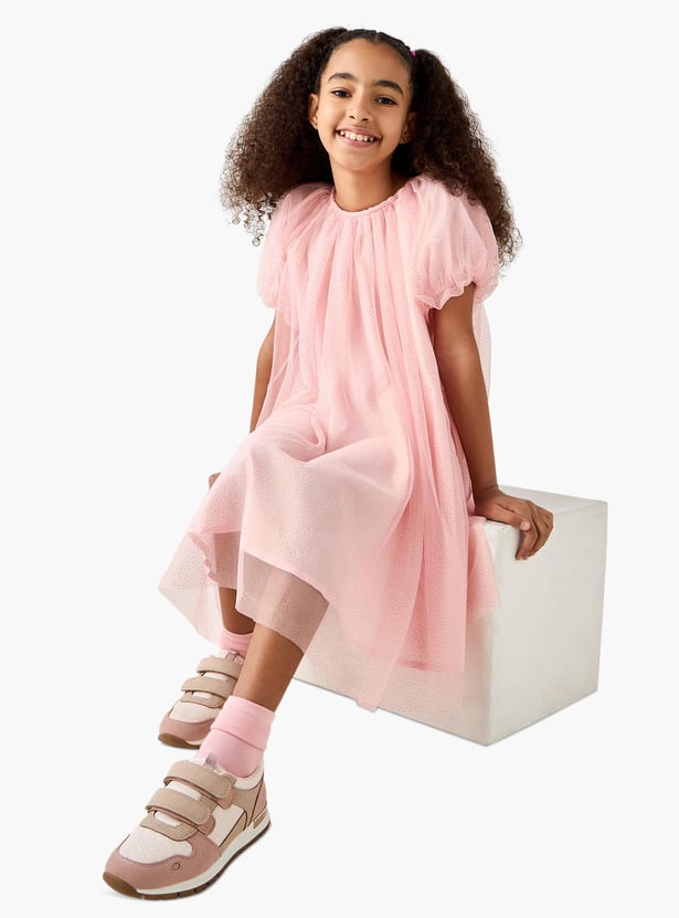 This charming embellished round-neck dress features a stylish round neckline and short sleeves, perfect for older girls. Adorned with delicate embellishments, it adds a touch of elegance to any occasion. The comfortable fit and trendy design make it a must-have addition to her wardrobe.