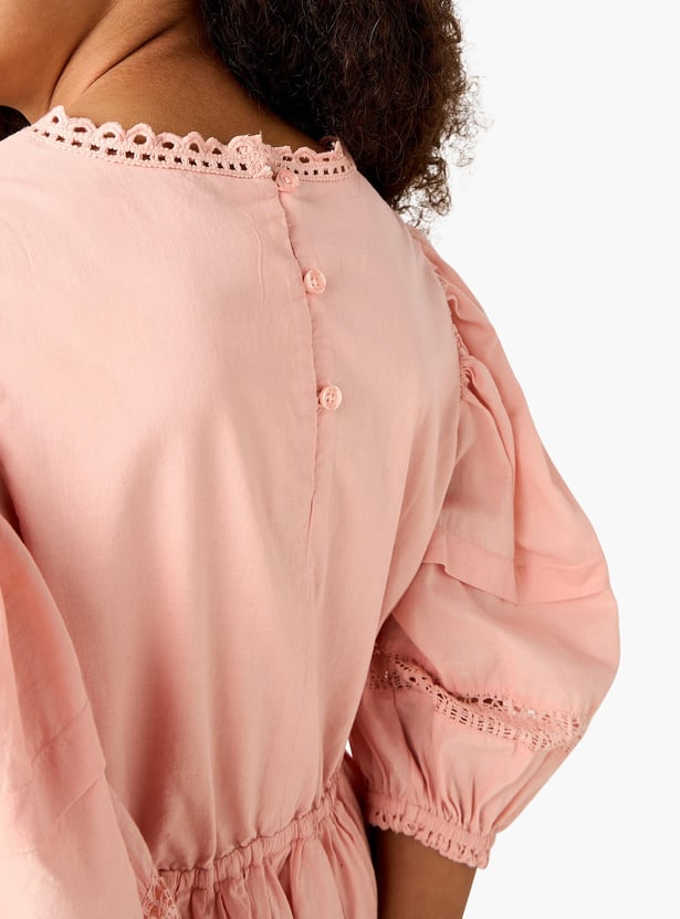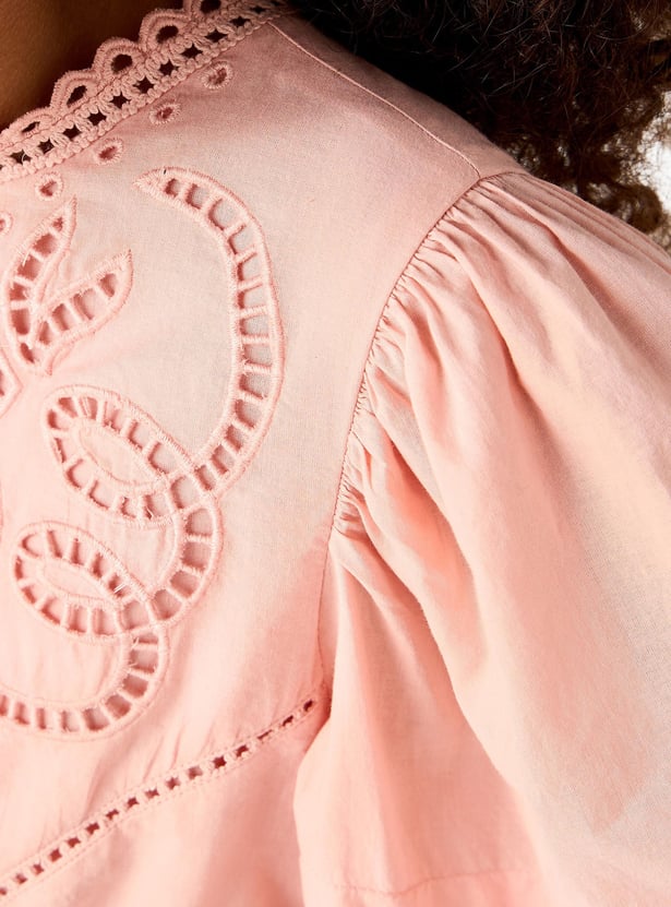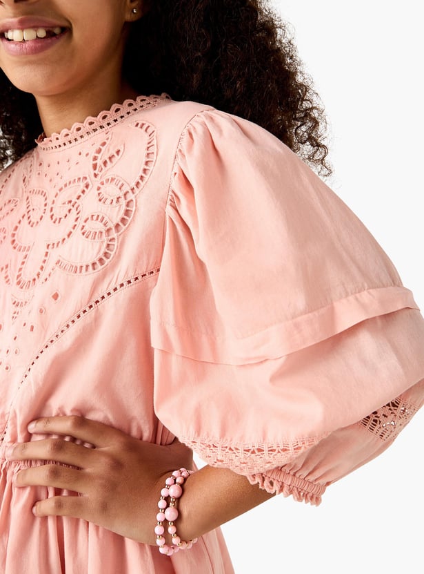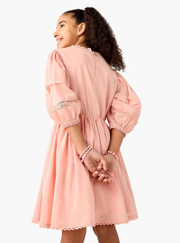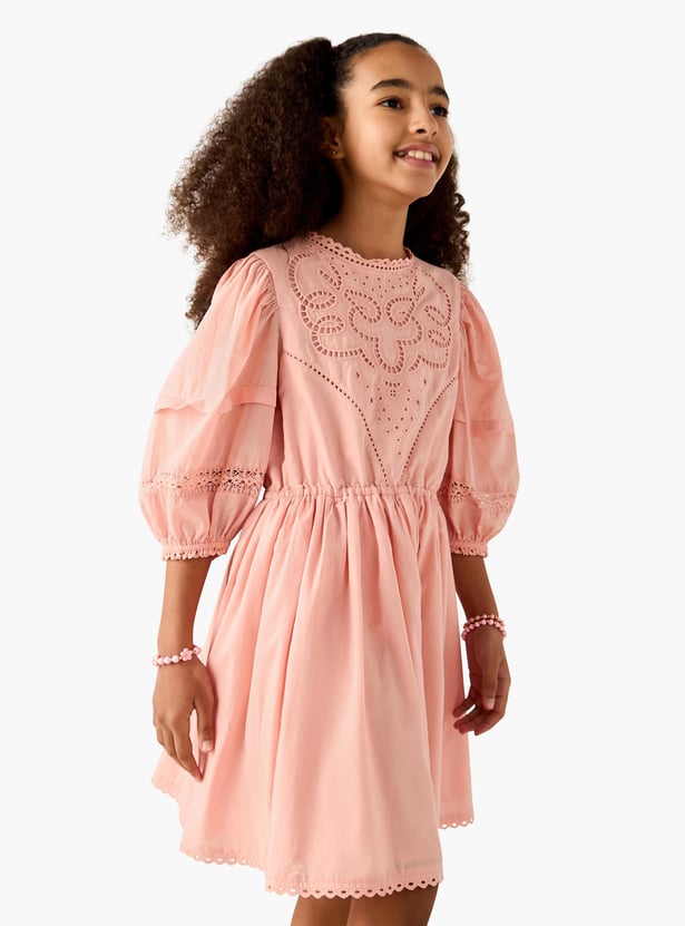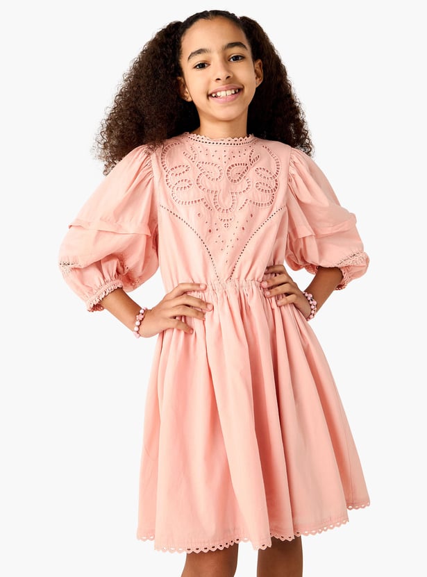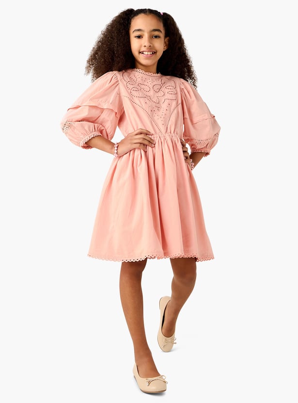 Juniors Embroidered A-Line Dress with Puffed Sleeves