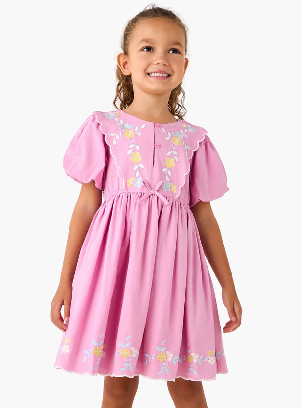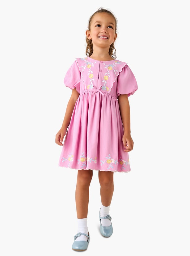 This charming dress for toddler girls features delicate floral embroidery along the scalloped panel and hem, adding a touch of whimsical elegance. Designed with sweet balloon sleeves and a gently cinched waist, it creates a delightful silhouette that’s both stylish and comfortable. Perfect for special occasions or everyday moments with a hint of charm, this dress keeps your little one feeling cozy and carefree, crafted from soft, breathable fabric for all-day comfort.