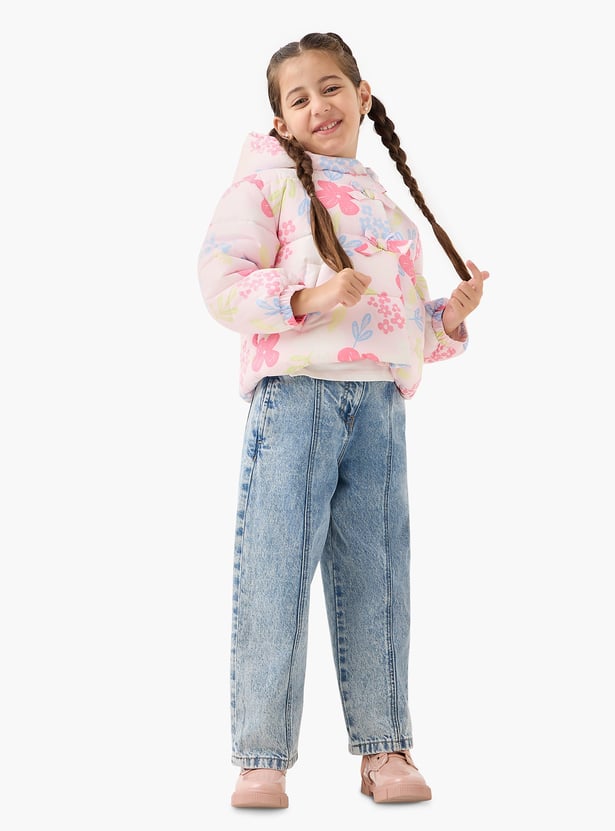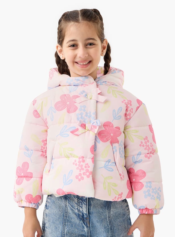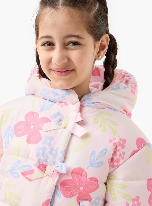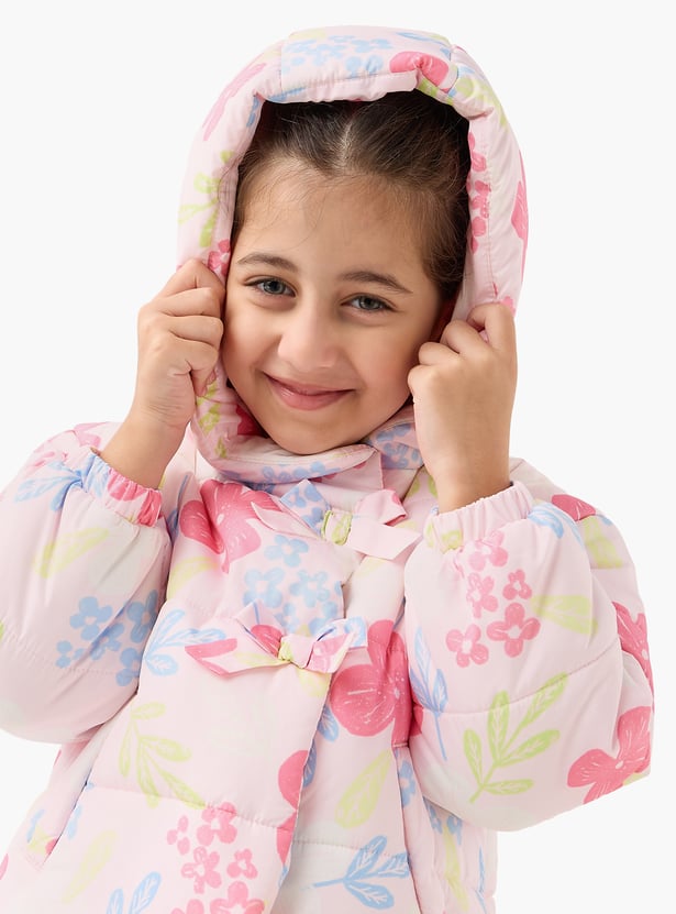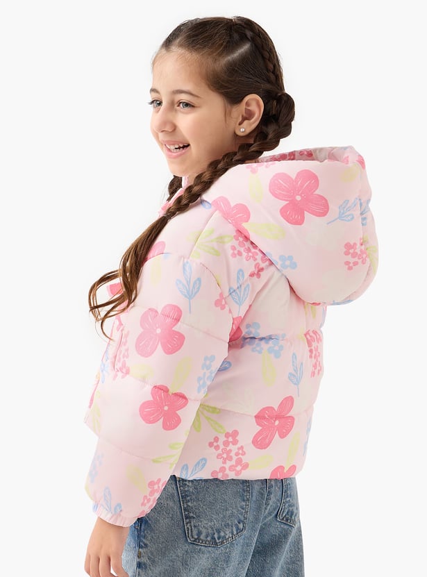 Juniors Floral Print Hooded Heavy Jacket with Long Sleeves