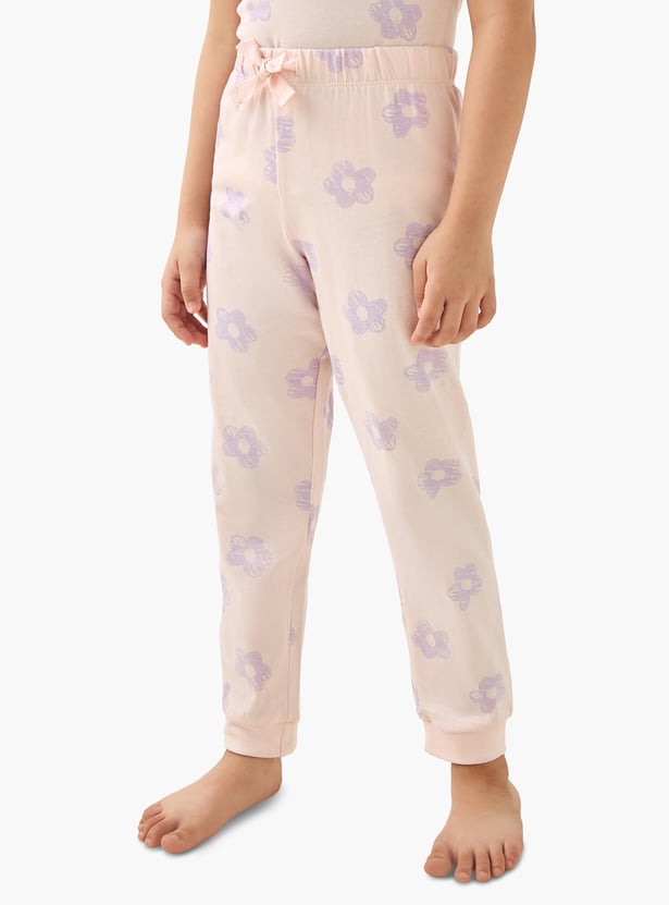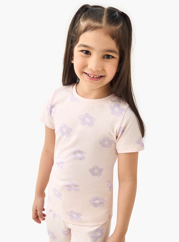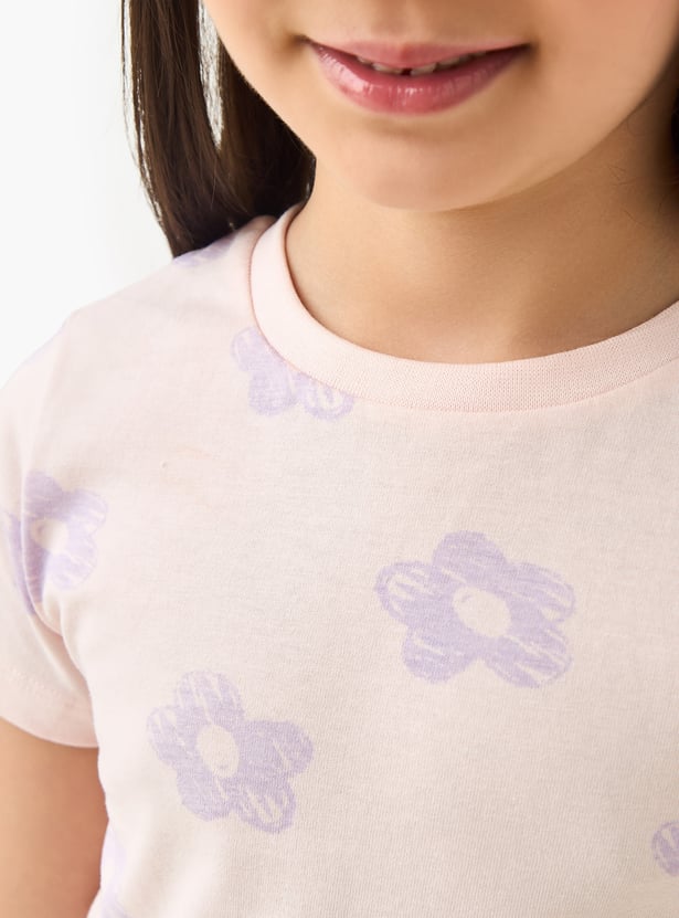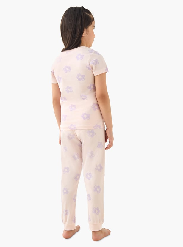 Add a touch of floral charm to bedtime with this t-shirt and pyjama set. Featuring delicate flower prints and crafted from soft, breathable fabric, it ensures a cosy night's sleep. The short-sleeved tee pairs beautifully with the cosy pyjamas. Perfect for winding down after a busy day. A sweet and stylish sleepwear choice for little dreamers.
