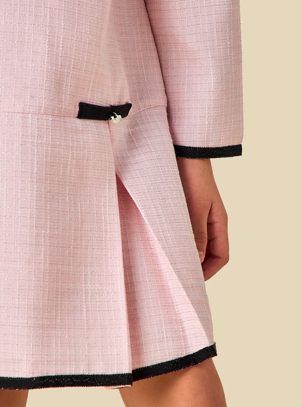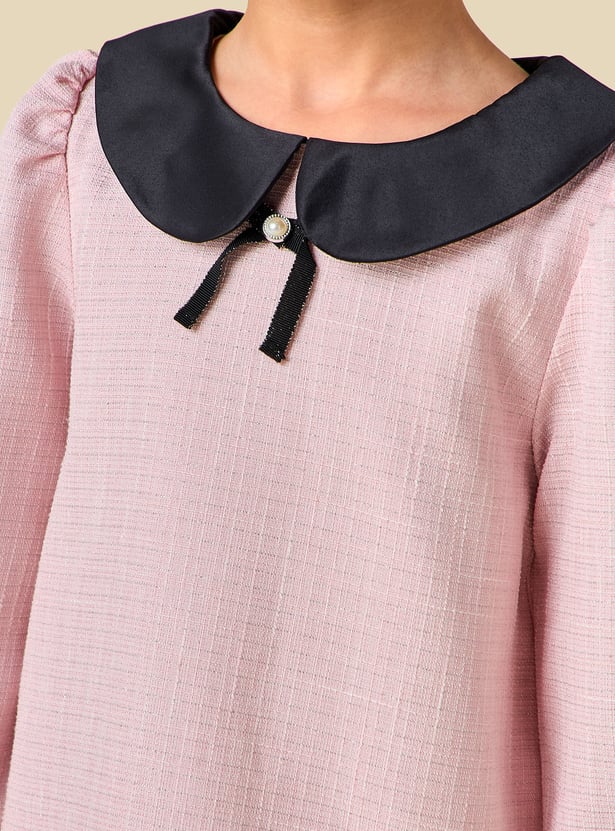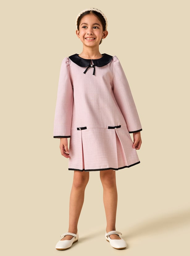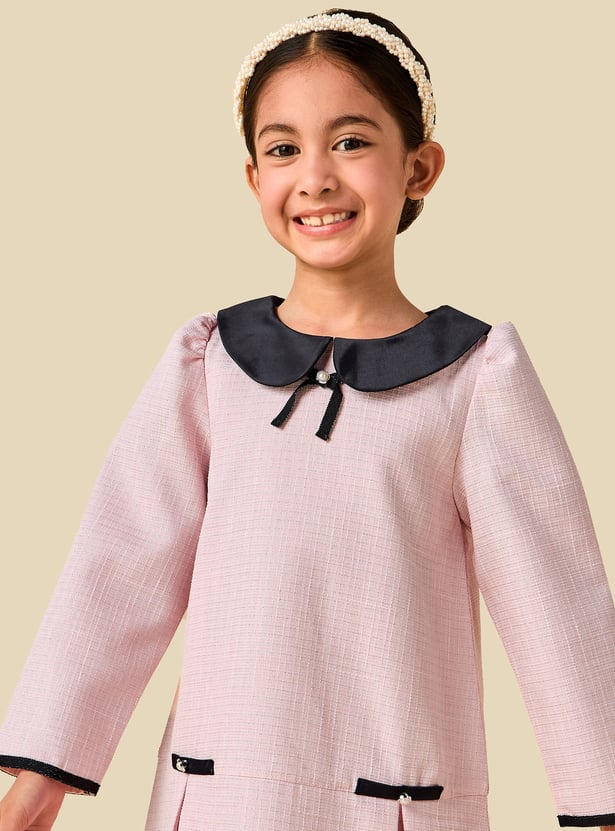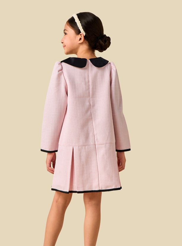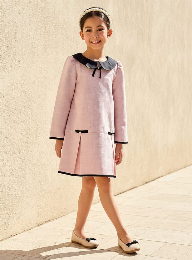 This charming textured dress showcases a classic Peter Pan collar and elegant pleats, creating a timeless look for special occasions. The long sleeves add warmth while enhancing the graceful silhouette, making it perfect for cooler days. Finished with delicate pearl embellishments, this beautifully crafted dress blends comfort with refined style, ensuring your little one looks polished and feels confident.