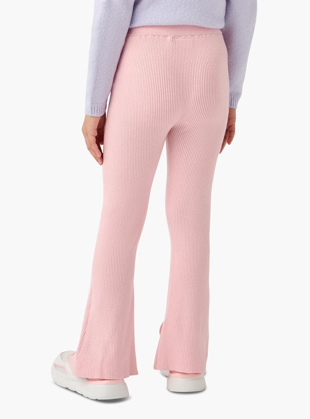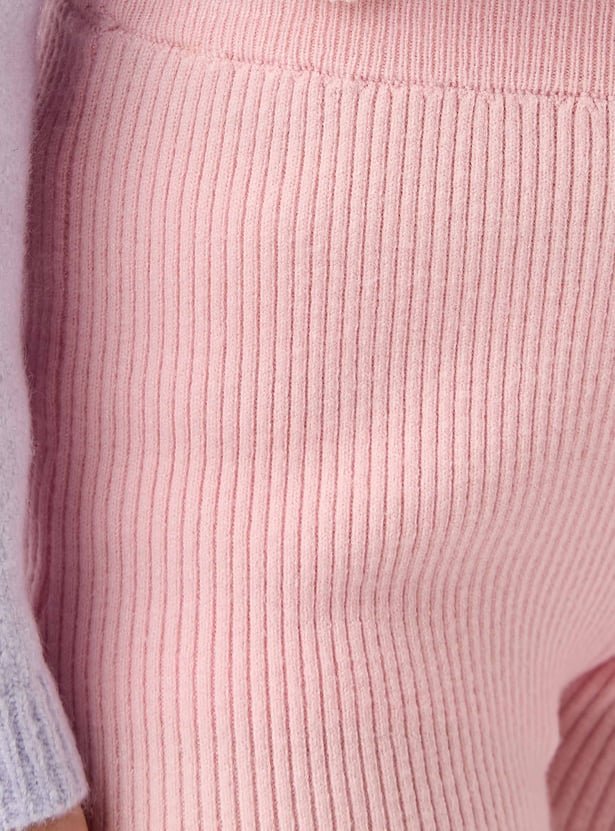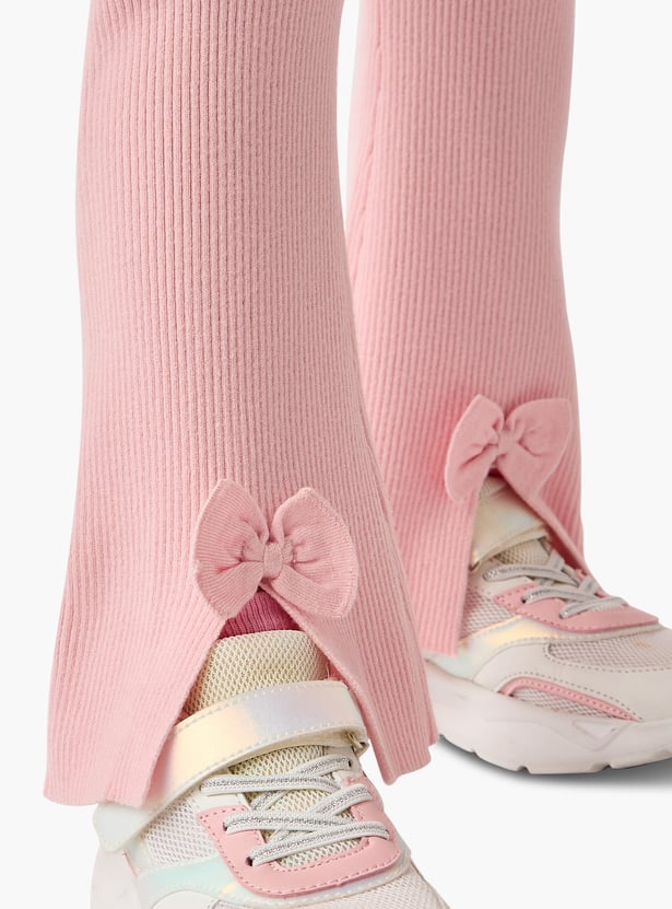 These ribbed knit pants offer a stylish and comfortable fit for everyday wear. The flared design with bow detailing adds a touch of charm, making them perfect for various occasions.