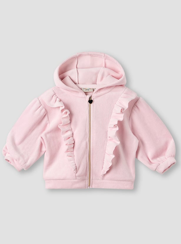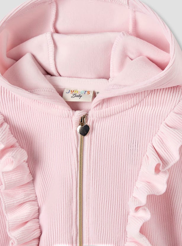 Have your kid stay cosy and stylish with this ribbed hooded sweatshirt top, featuring playful details for a fun twist. The sweatshirt is designed with a cute ruffle trim. Perfect for casual days or lounging, this set combines comfort, style, and a touch of whimsy.