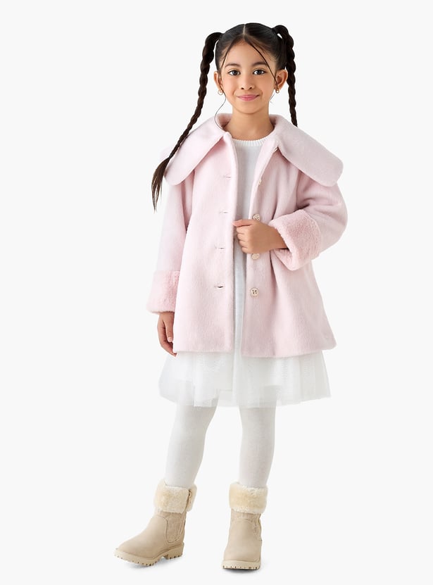This charming girls' coat features a stylish Peter Pan collar and a soft, comfortable fabric, perfect for cooler weather. The button-front closure ensures a secure fit, while the long sleeves provide ample warmth. Ensure your little one stays cosy and fashionable with this delightful outerwear piece.