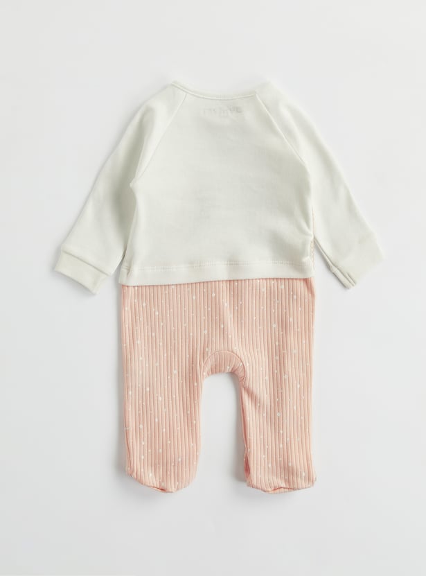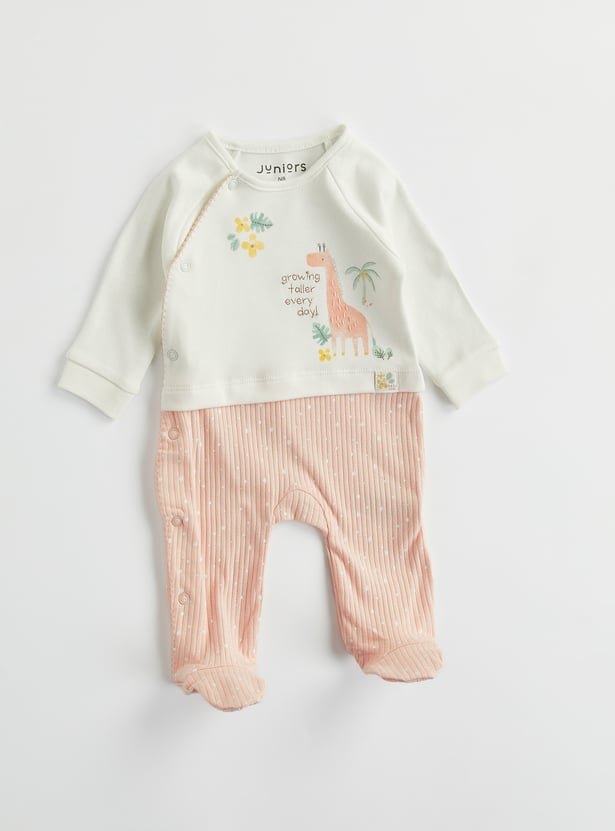 Wrapped in soft pastels and tiny playful details, this Juniors textured sleepsuit with button closure brings a gentle charm to your baby’s everyday comfort. Designed with a round neckline, full sleeves, and a relaxed silhouette, it keeps little ones cozy while allowing easy movement. The side button closure ensures quick changes, while the softly fitted waist and footed bottom offer a snug, secure feel through naps and nighttime cuddles. Crafted from soft, breathable fabric with a lightly textured finish for all-day comfort on delicate skin.