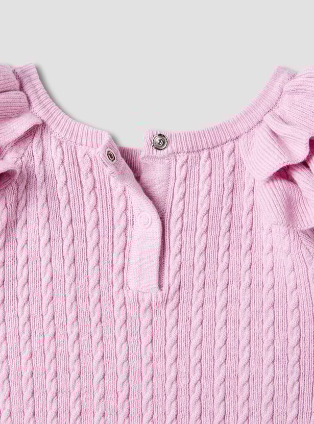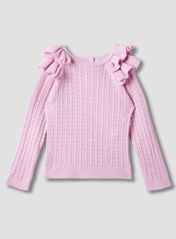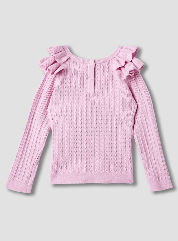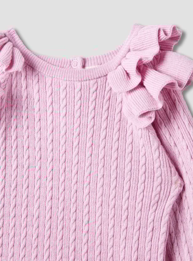 This charming textured sweater is a delightful addition to any kid's wardrobe. The ruffled detail on the shoulders adds a touch of elegance, while the soft knit fabric ensures comfort and warmth for cooler days. This sweater is perfect for layering over a simple tee or wearing on its own, offering versatility for a variety of occasions.