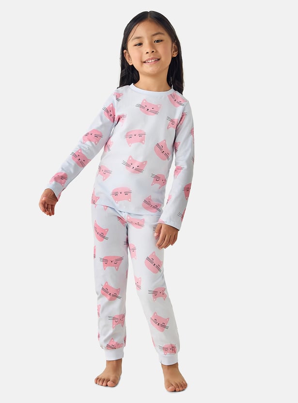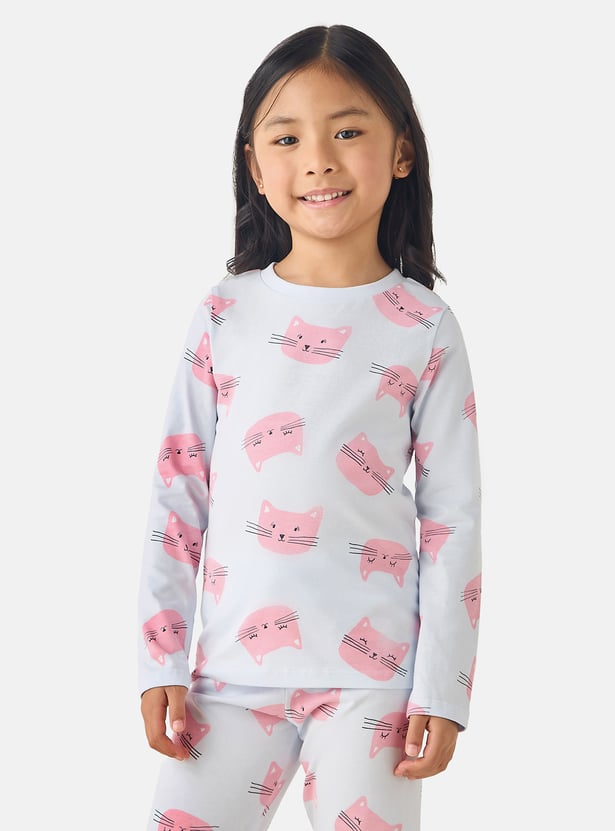 Juniors Cat Print Long Sleeves T-shirt and Pyjama Set