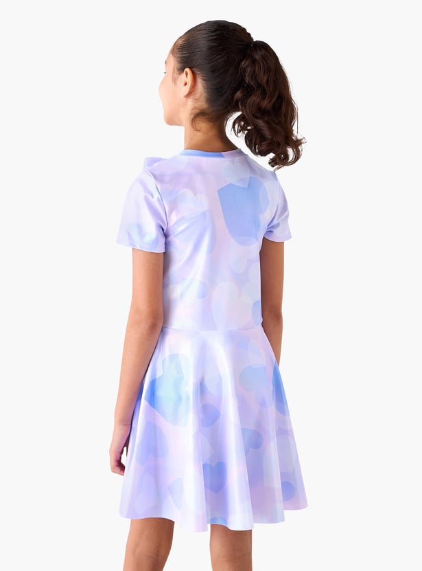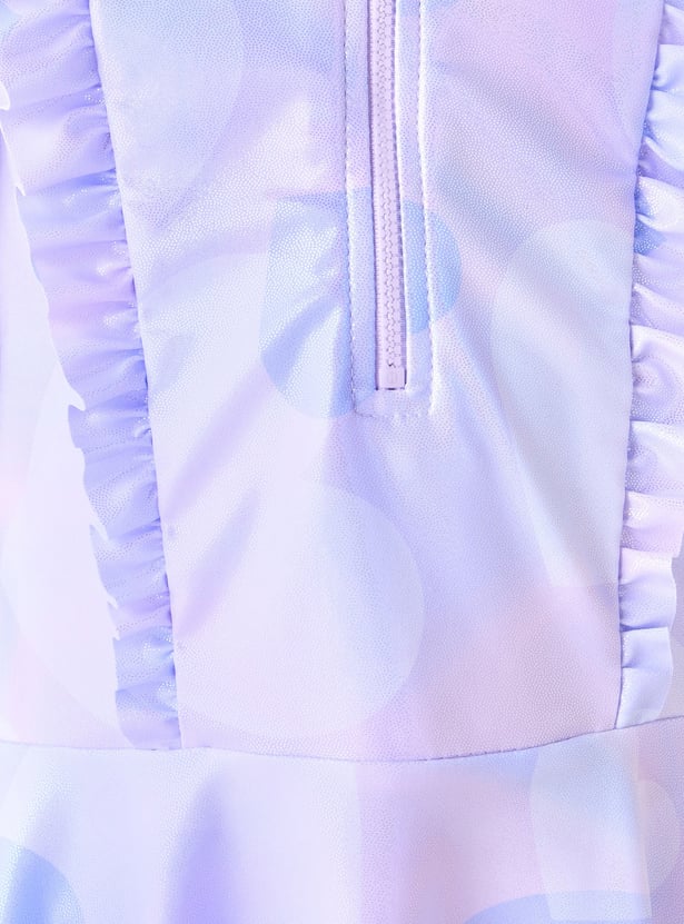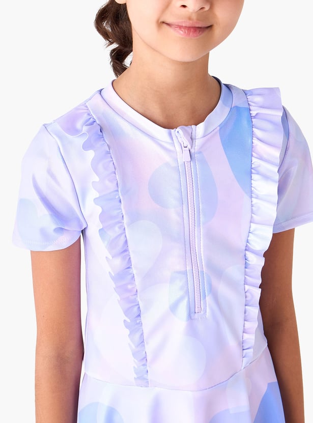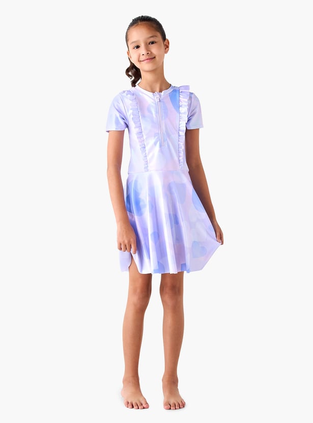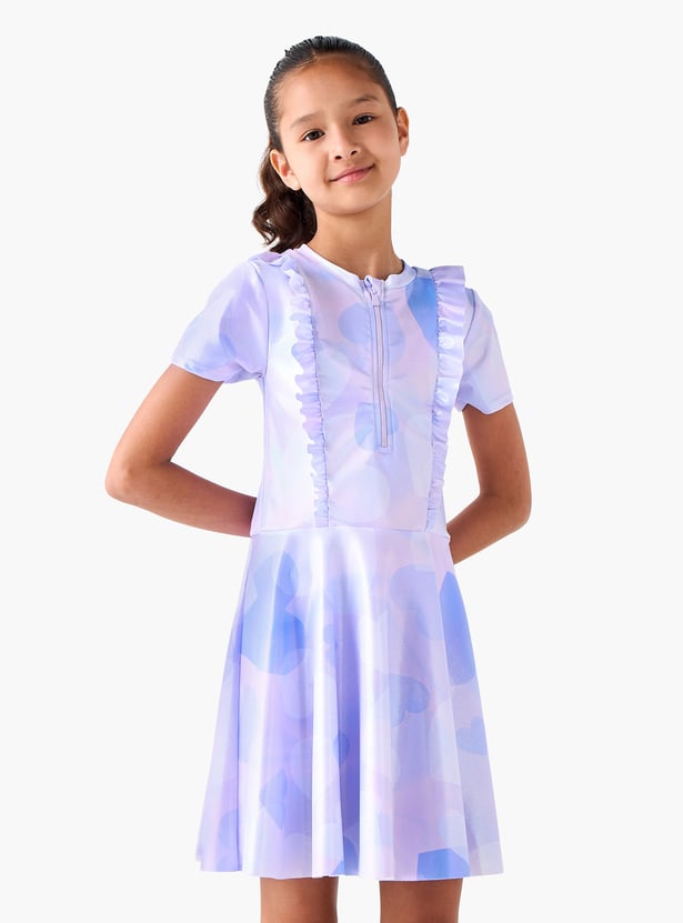 This charming heart print swim dress is perfect for making a splash. Featuring a delightful pattern and elegant ruffles, this swim dress has a mock collar, half sleeves, and a zip placket. The integrated shorts provide additional coverage. The quick-drying fabric provides practical functionality for swimming and beach activities.