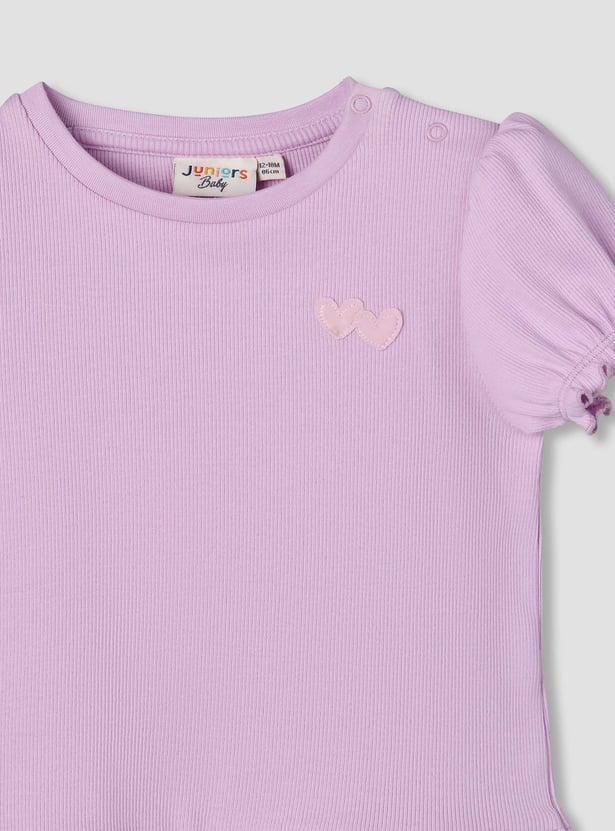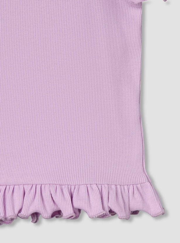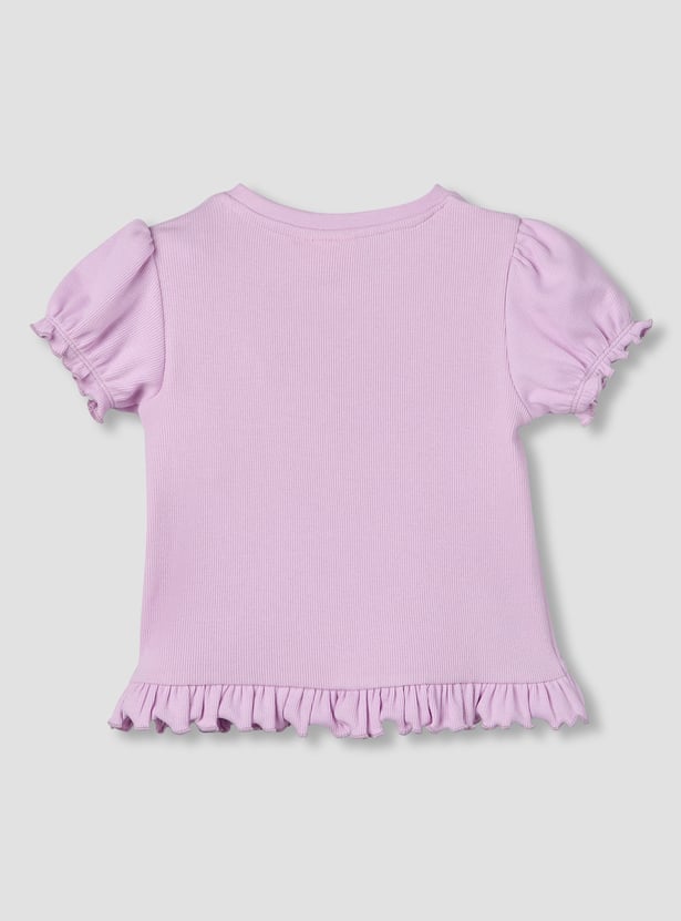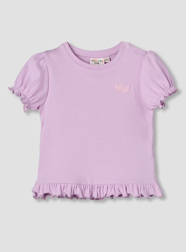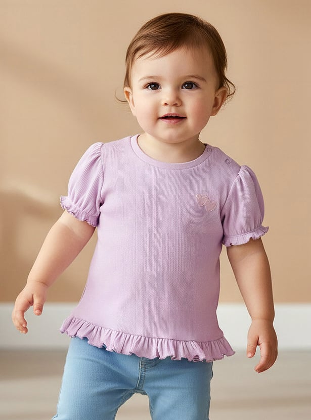 Adorn your little one with this ribbed T-shirt, featuring a round neck, puff sleeves, and a ruffled hem for a sweet touch. Crafted from soft, breathable fabric, it ensures comfort and style, perfect for playful days or casual outings.