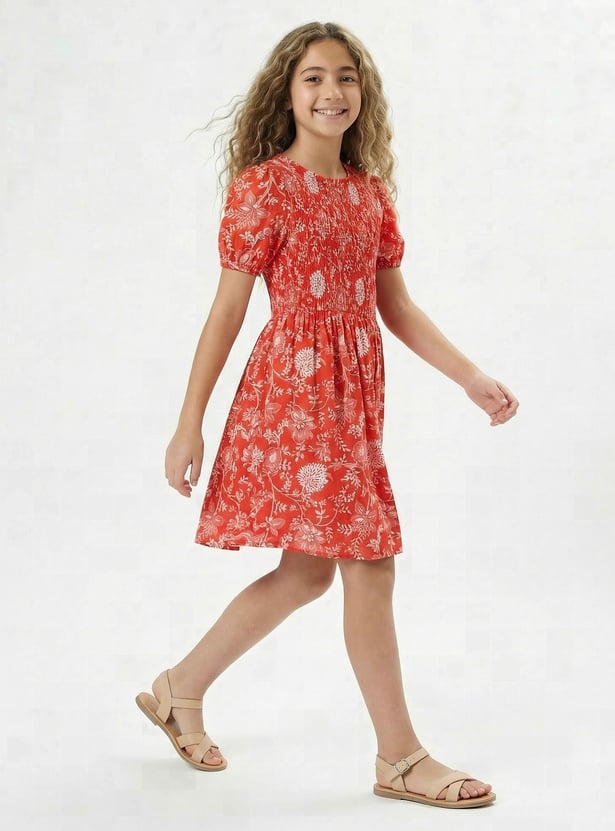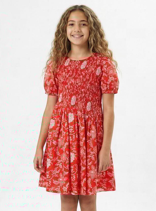 Add charm to her wardrobe with this floral print dress. Featuring an all‑over floral print, short puff sleeves, and a round neckline, this dress offers a classic silhouette. The smocked design ensures a secure fit and ease of movement, while the soft fabric provides all‑day comfort.