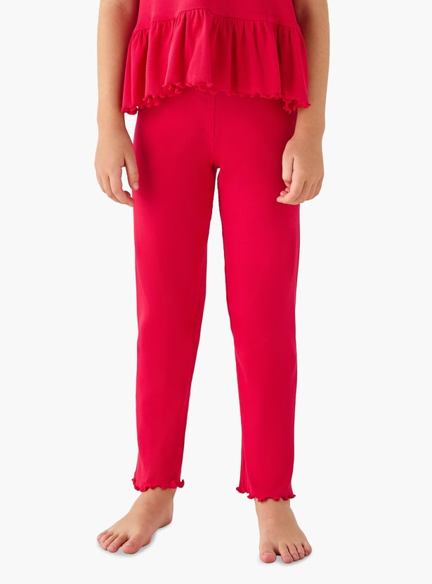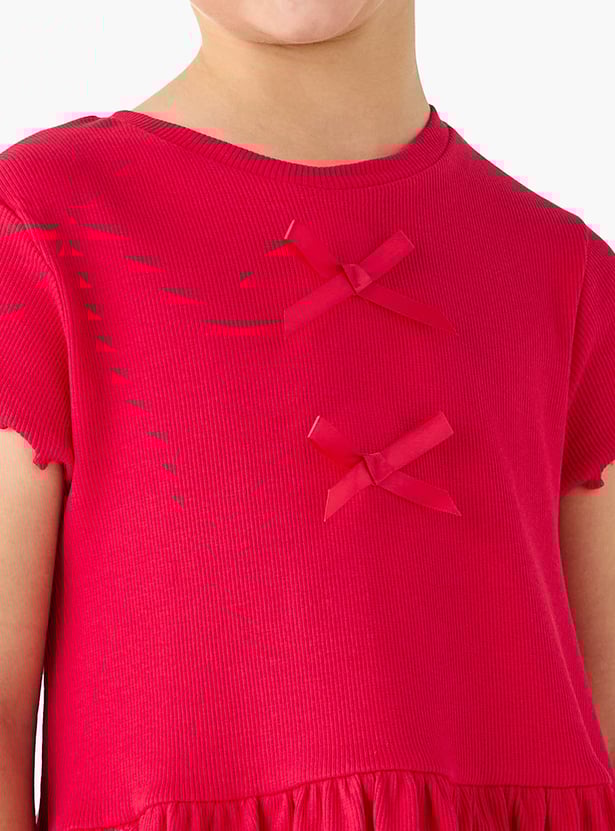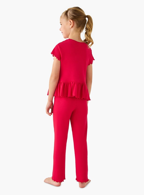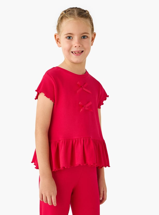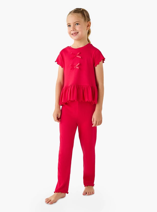 This charming pyjama set features a ribbed top and pants for a comfortable night's sleep. The top is adorned with delicate bows and a ruffled peplum, adding a touch of sweetness. Soft and stretchy ribbed fabric ensures a restful slumber. This two-piece set is perfect for bedtime and lazy weekends.
