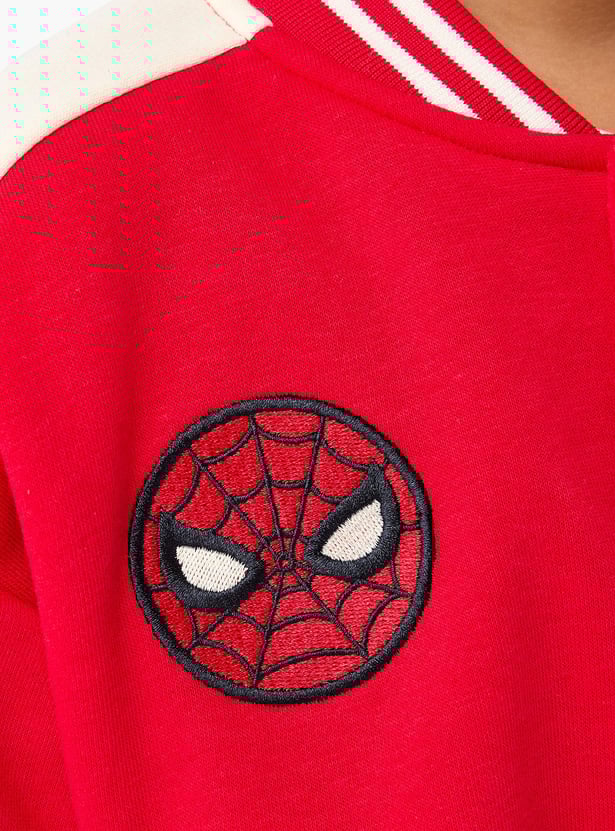 This Spider-Man embroidered varsity jacket for boys, crafted from soft, comfortable material, is perfect for everyday wear. The baseball-style design features a front button closure and contrasting sleeves, offering a sporty and stylish look. It features embroidered Spider-Man details, making it a must-have for young superhero fans.