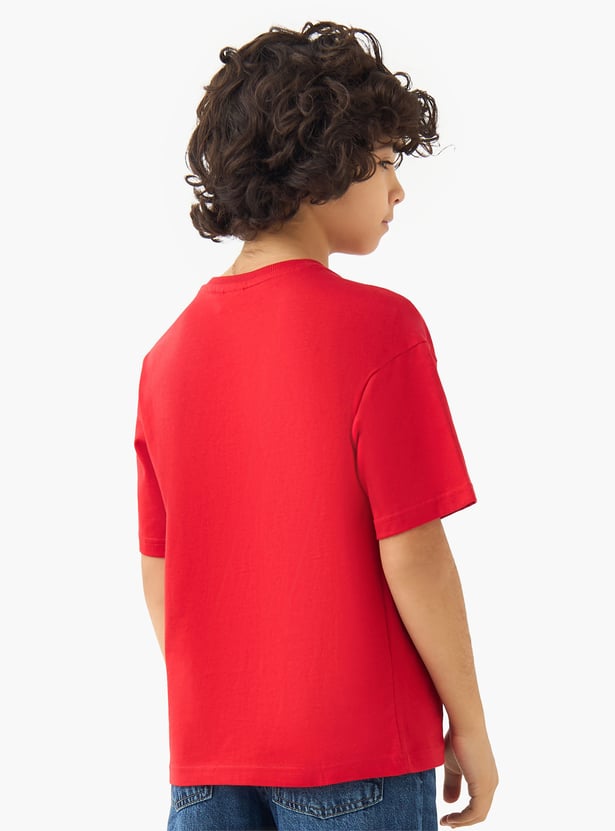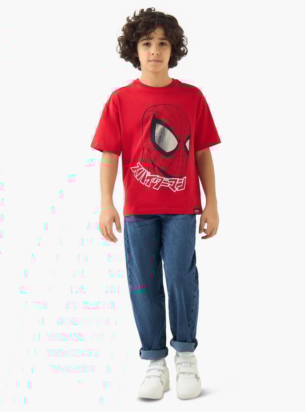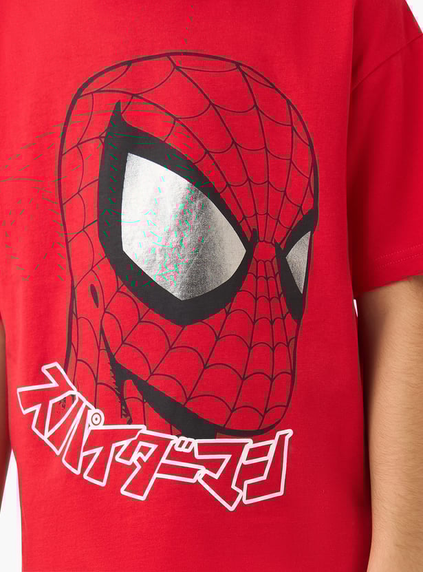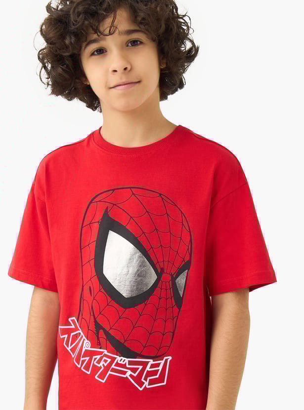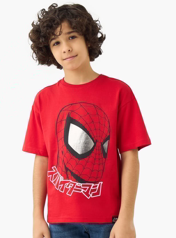 Let your little one swing into adventure with this T-shirt. Crafted for comfort, this short-sleeved tee features a striking Spider-Man print on the front, metallic print detailing, drop shoulders, and a crew neck. The soft and breathable fabric ensures lasting comfort.