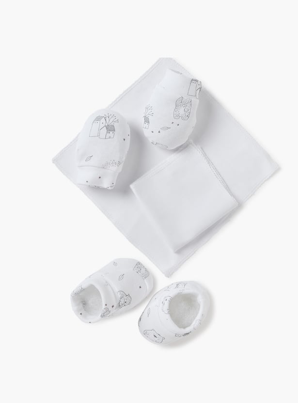 This clothing gift set includes a t-shirt, pants, cap, mittens and more. This set features a charming bear print, offering both comfort and style. This thoughtful gift set is perfect for newborns and infants and ensures a coordinated look for every occasion. The soft and breathable fabrics provide ultimate comfort for your little one.