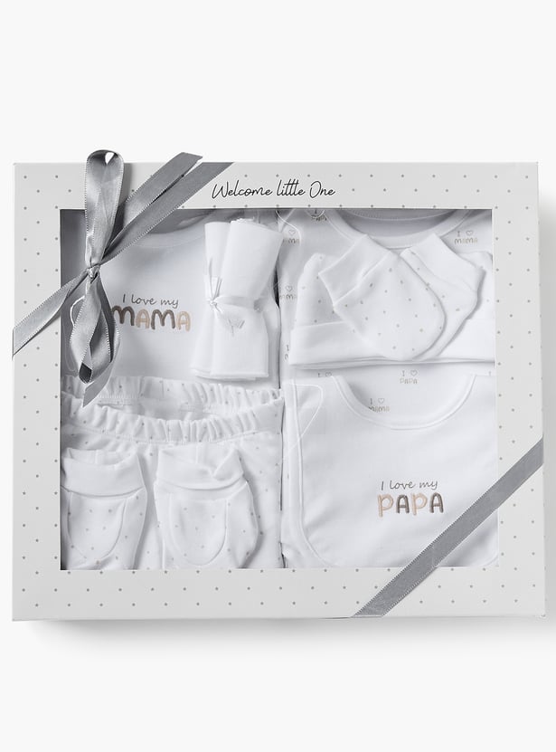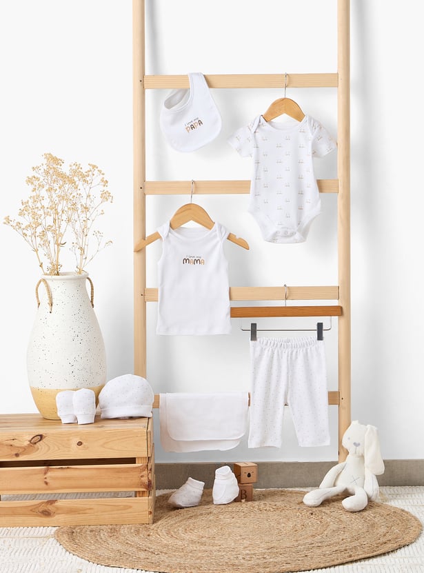 This charming nine-piece clothing gift set is perfect for baby boys, featuring adorable printed designs. Crafted from soft fabric, it ensures comfort for your little one's casual wear. Ideal as a thoughtful gift, this set celebrates the joy of family moments.