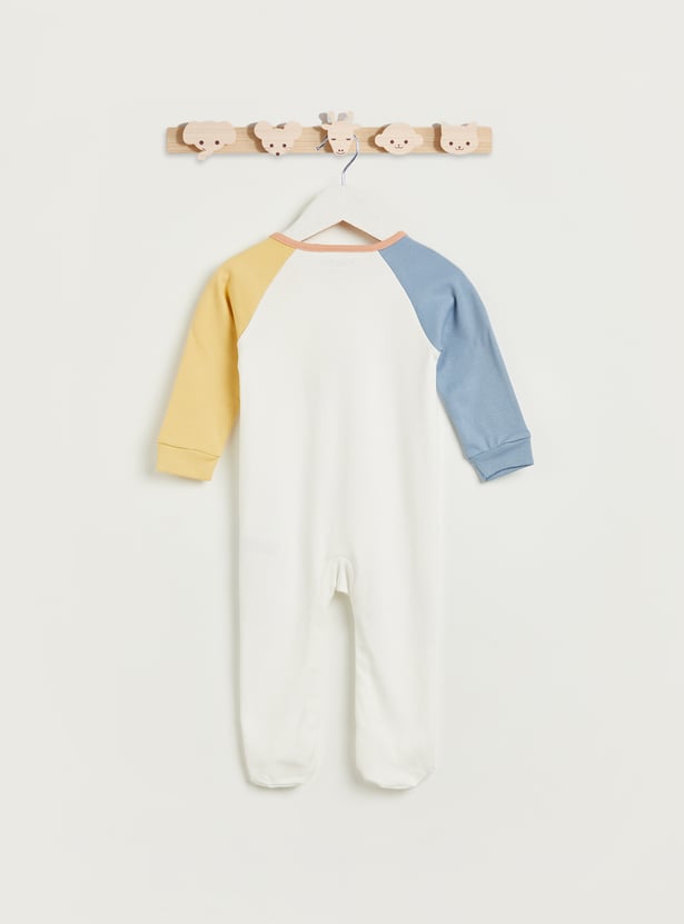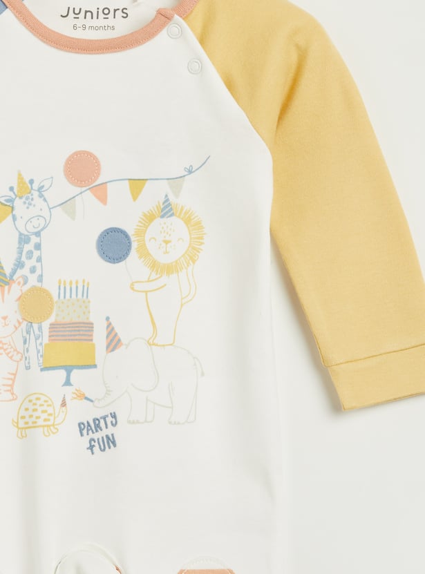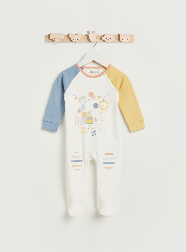 Soft colours and playful animal prints make this animal print sleepsuit a cosy everyday essential. Designed with a crew neckline, full sleeves, and a relaxed fit, it allows easy movement while keeping little ones comfortable. The button closure ensures quick dressing and hassle-free changes. Made from soft, breathable fabric for gentle, all-day comfort.