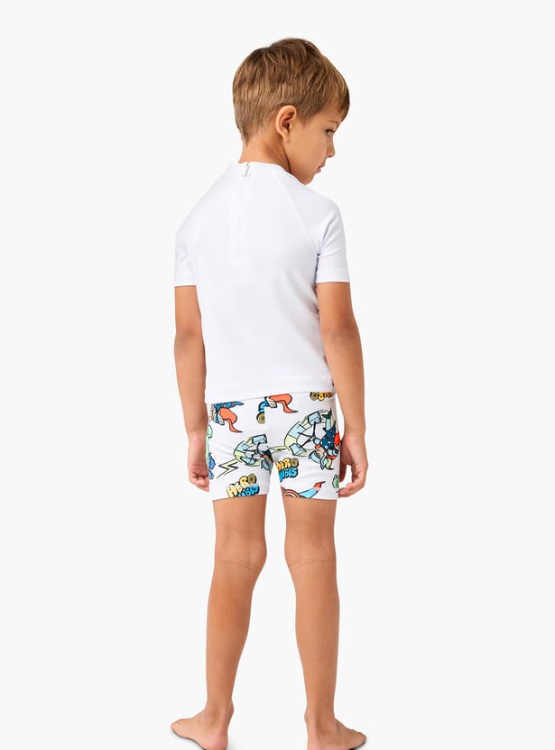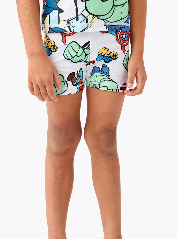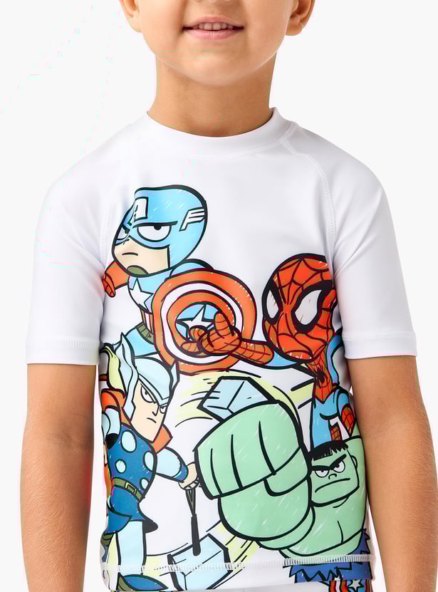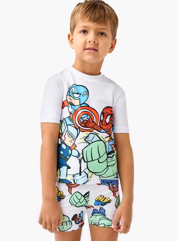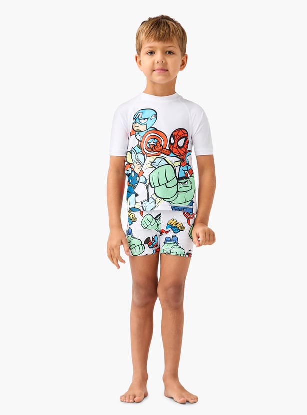 These Avengers print swimwear set, featuring a t-shirt and trunk set, is perfect for young superhero fans. These sets typically showcase vibrant and fun Avengers-themed prints, making them ideal for pool or beach outings. The t-shirt provides extra sun protection, while the trunks ensure a comfortable fit for active play.