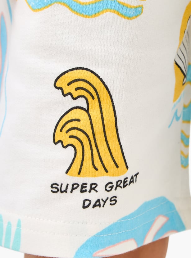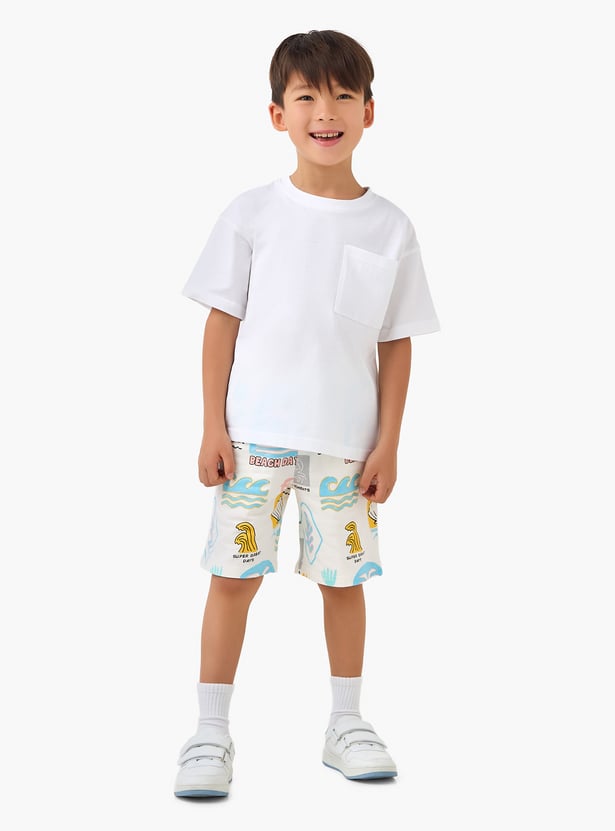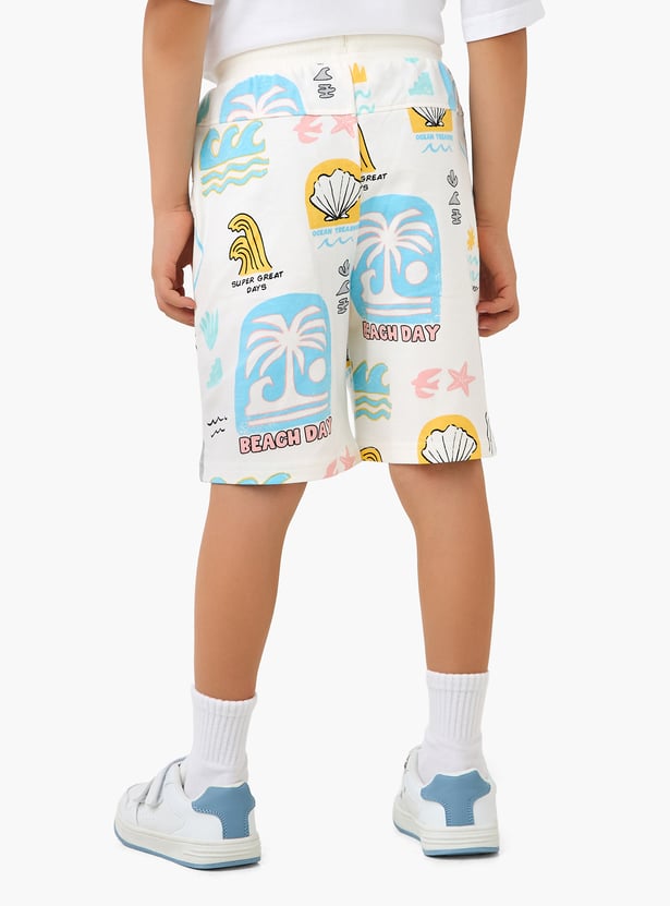 Discover these comfortable shorts for boys, perfect for warm weather adventures. Featuring a playful all-over print with beach-themed graphics, these shorts offer a relaxed fit for unrestricted movement. The elasticated waist with an adjustable drawstring ensures a secure and comfortable fit, making them ideal for everyday wear or seaside excursions.