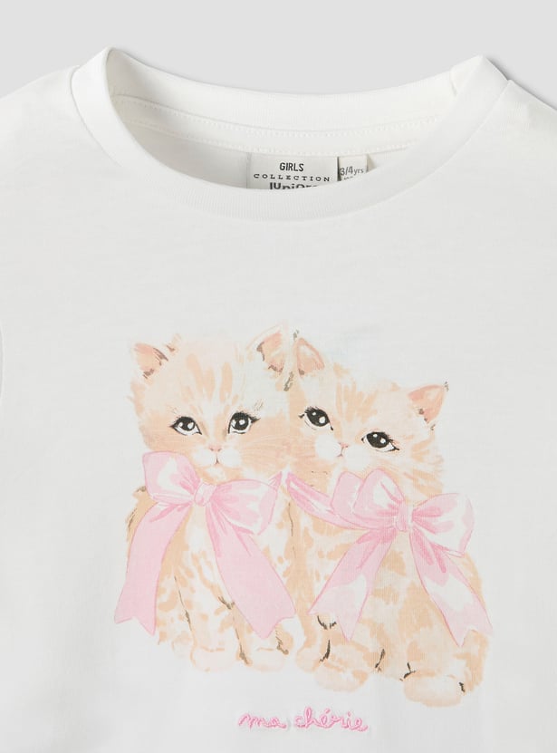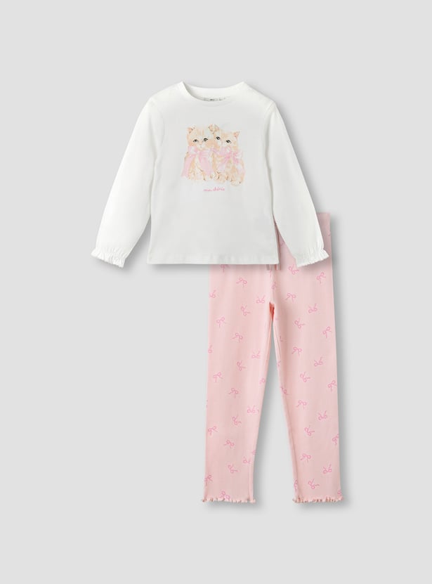 Let your little one lounge in comfort with this adorable cat print t-shirt and pyjama set. Made from soft, breathable fabric, it ensures a cosy fit through the night. The cute cat design adds a playful charm kids will love. The elasticated waistband provides ease of movement. Perfect for bedtime or relaxed days at home.