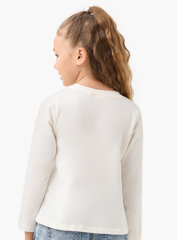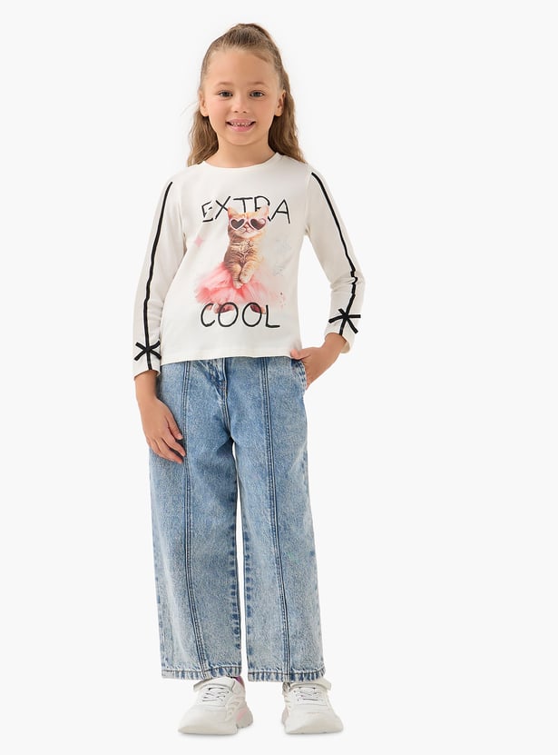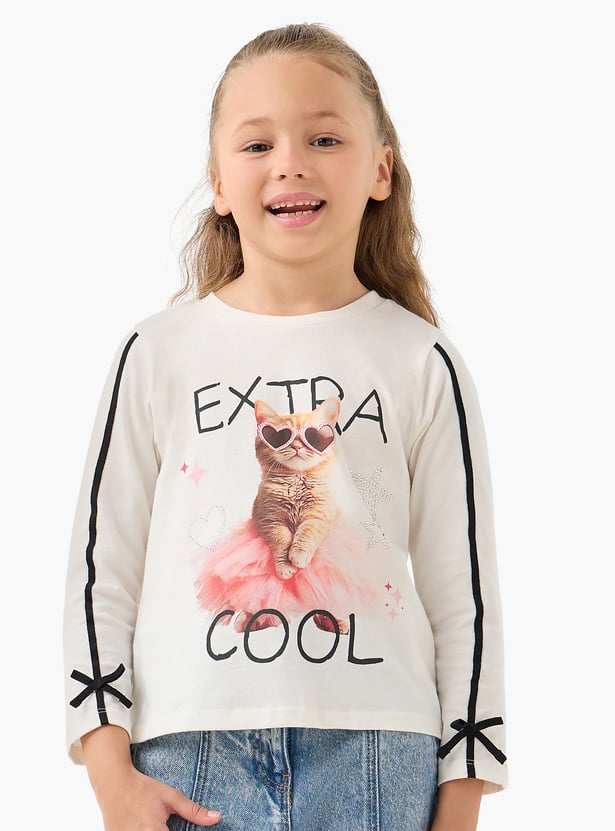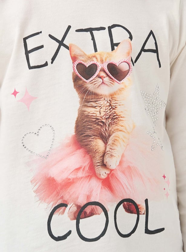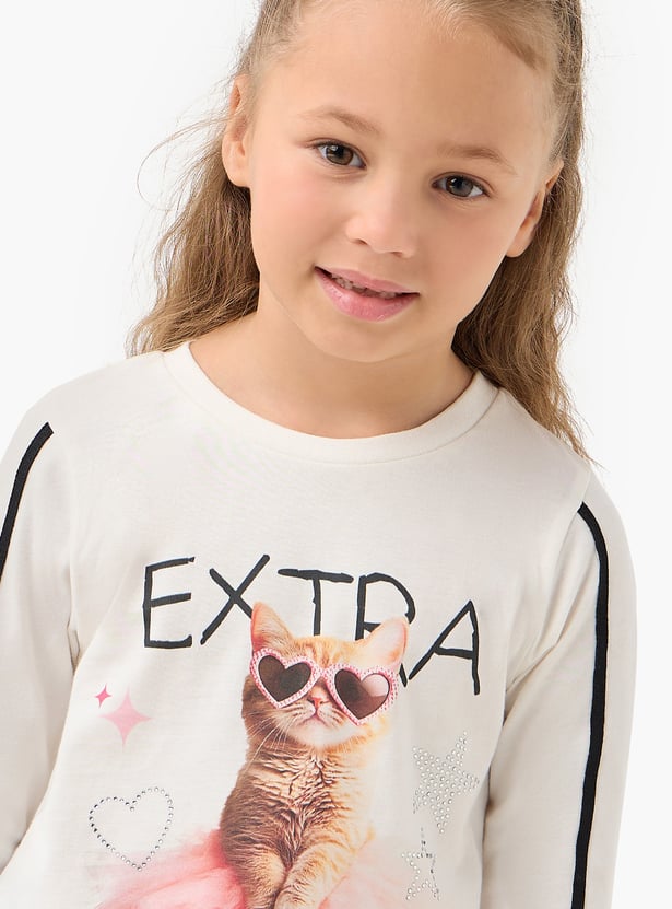 Introduce playful charm to her wardrobe with this delightful girls top, featuring an 'Extra Cool' slogan. This long sleeve top for girls showcases a charming cat print, accented with sparkly details and a three-dimensional tulle skirt for a touch of glamour.