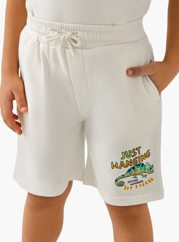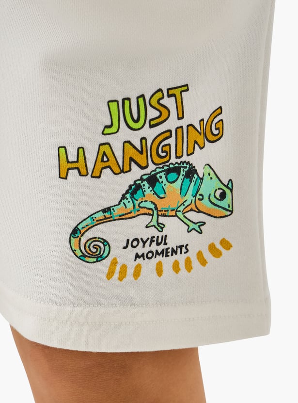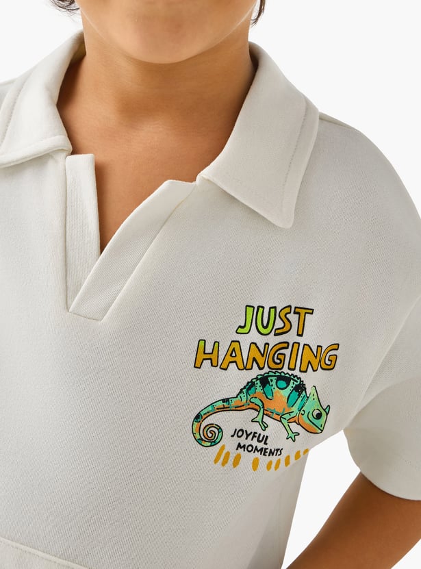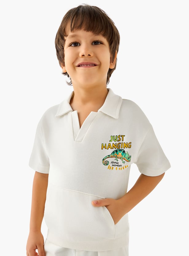 This charming two-piece set for boys brings together playful style and everyday comfort, perfect for little adventures. The polo t-shirt stands out with a delightful chameleon print, a fun phrase, and a cosy kangaroo pocket for added charm. The matching shorts feature handy side pockets and an elasticated drawstring waist for an easy, secure fit. Crafted from soft, breathable fabric for lasting comfort.