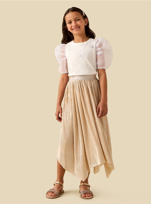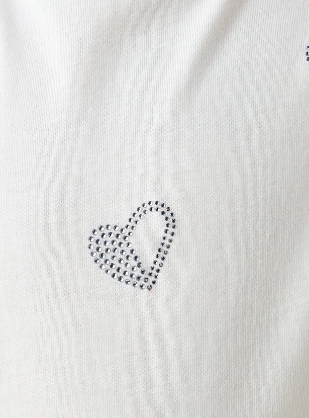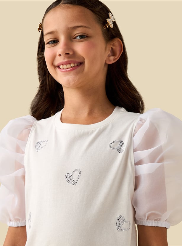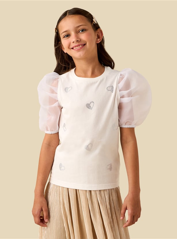 Sweet details meet everyday comfort in this top. It features a classic crew neck and sheer puff sleeves that add a touch of volume. The front is accented with heart-shaped embellishments for subtle sparkle. Crafted from soft fabric, it ensures a comfortable feel throughout the day.
