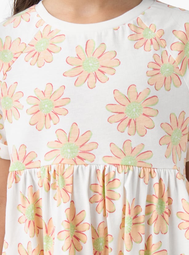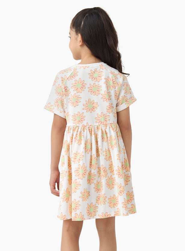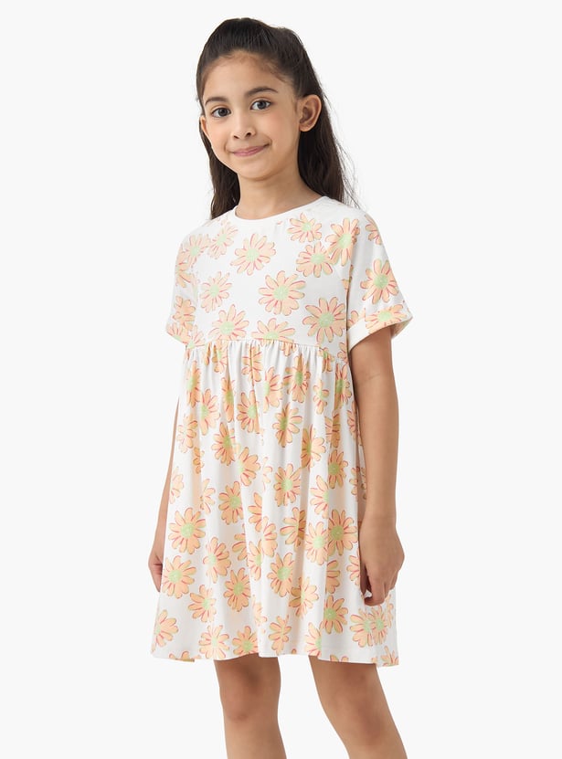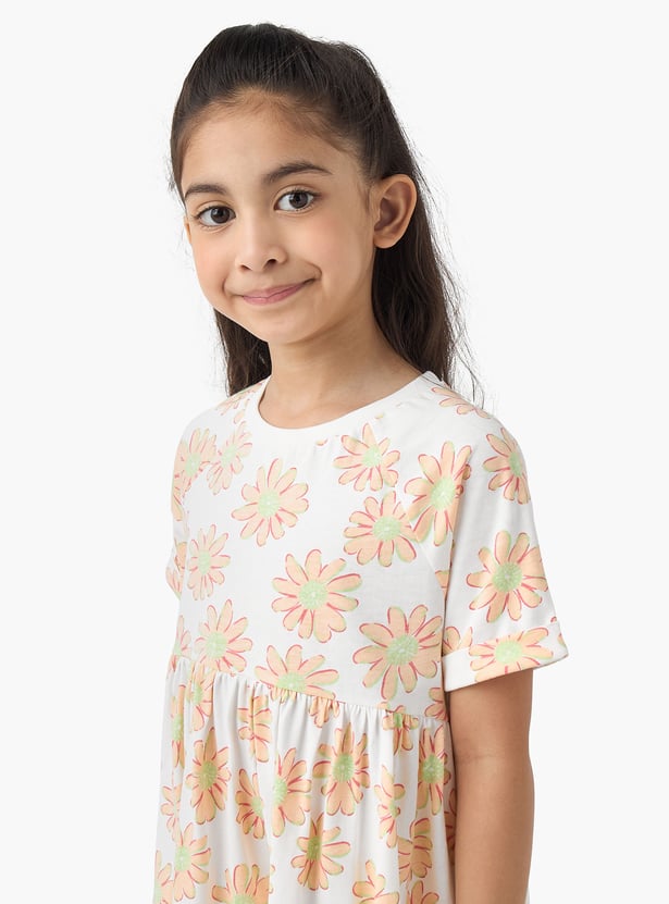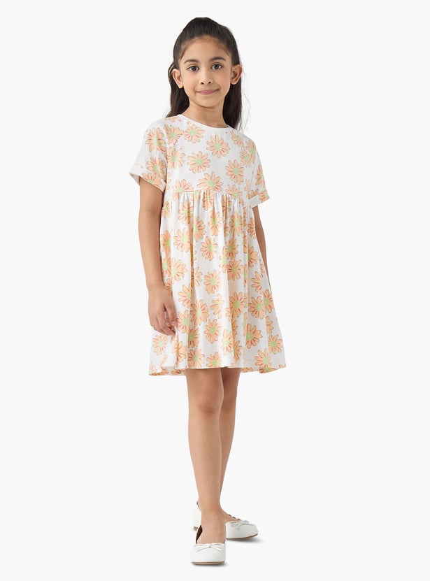 Adorn your little one in charming style! This A-line dress showcases delicate floral patterns, a round neck, and half sleeves, all made from comfort fabric for ease of movement and all‑day wear.