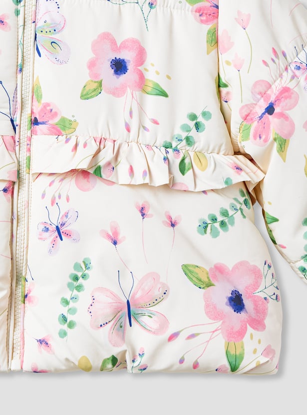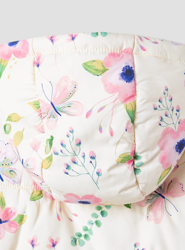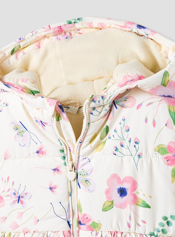 Juniors Floral Print Hooded Heavy Jacket with Long Sleeves